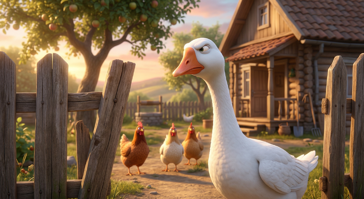 Семён Семёныч был гусь. Но если бы кто-нибудь назвал его просто гусем – в лицо, при свидетелях, – Семён Семёныч счёл бы это оскорблением. Потому что просто гуси гуляют по двору и щиплют траву. А Семён Семёныч – руководил. Каждое утро он выходил из сарая ровно в шесть пятнадцать. Не в шесть. Не в полседьмого. В шесть пятнадцать. Потому что настоящий руководитель приходит раньше подчинённых, но не слишком рано – чтобы не подумали, будто ему нечем заняться дома. Первым делом обход территории. Семён Семёныч вышагивал вдоль забора, вытянув шею и слегка прищурив левый глаз. Правый прищуриваться не умел, но левого хватало. Если доска в заборе шаталась, Семён Семёныч останавливался, смотрел на неё долго и неодобрительно, а потом шёл дальше. Доска, конечно, не чинилась, но чувствовала себя виноватой. По крайней мере, Семён Семёныч был в этом уверен. Потом проверка личного состава. Куры, все восемь штук, к этому времени уже выбирались во двор и начинали заниматься ерундой. Семён Семёныч обходил