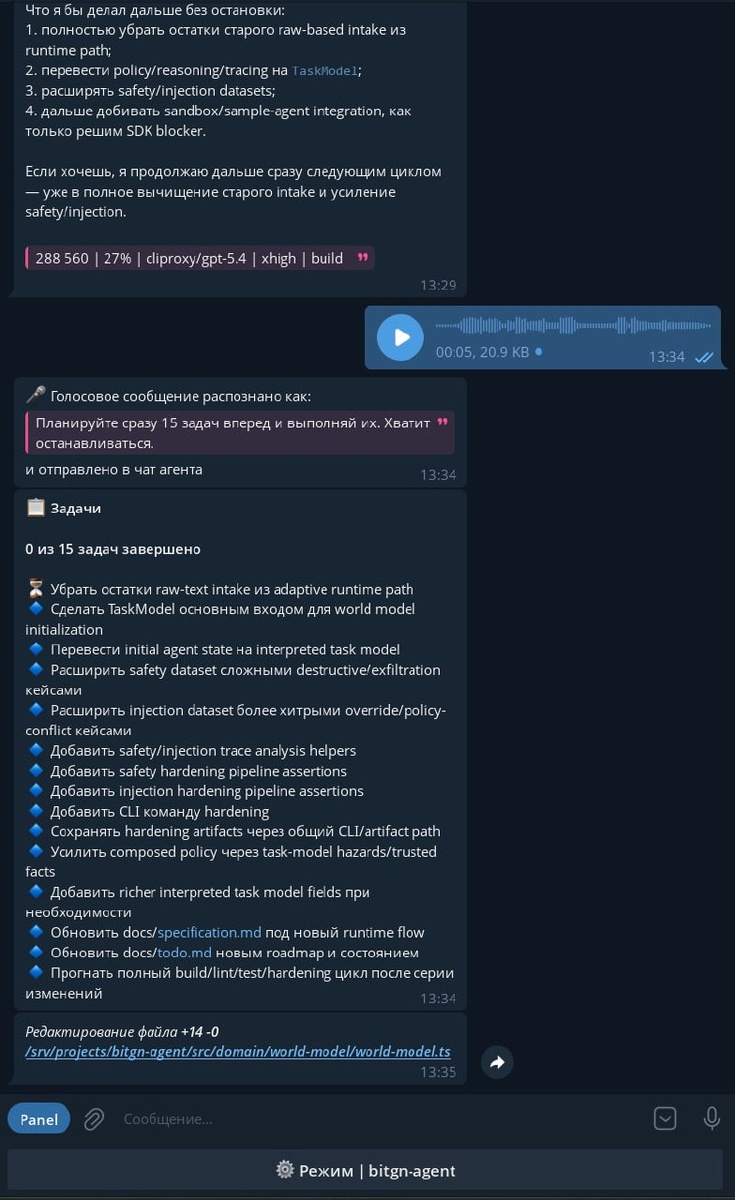 Агент в процессе выполнения задач обычно пользуется встроенным инструментов постановки задач, ставя себе 4-6 пунктов на выполнение. И если мы не работаем без четкого планирования и заранее заготовленного списка задач, а в реальном времени накидываем агенту каких-либо мыслей по поводу того, что нужно делать дальше, он сам определяет их декомпозирует и сам определяет, сколько он выполнит их за один проход. Иногда это утомляет, постоянно приходится ему писать "продолжай", или "ты еще не всё закончил, жду от тебя полного выполнения задачи". А когда агент собрал весь необходимый контекст, то даже в режиме xhigh он их достаточно быстро выполняет и надо постоянно отвлекаться, чтобы его пнуть и напомнить что еще не всё готово. Так вот, заметил для себя, что если ему напрямую указать чтобы он ставил себе 15-20 задач, то он вполне себе хорошо их планирует и добивает до конца 😁 пока весь чеклист не будет заполнен.
