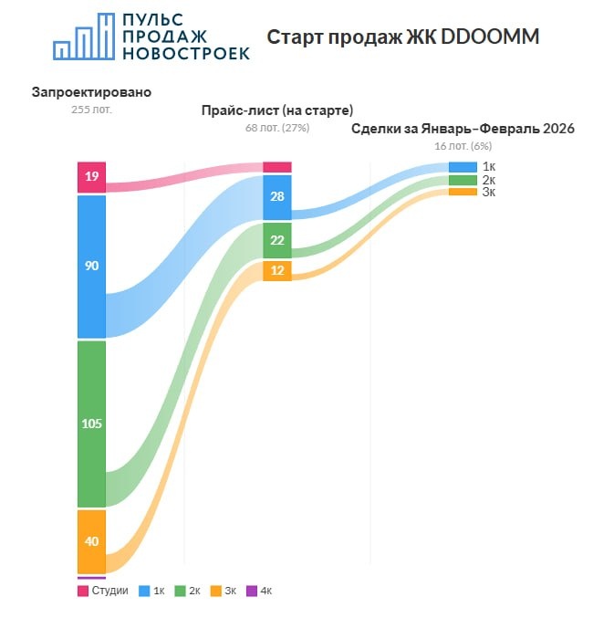 🏙 Проект от Dar в районе Аэропорт, премиум-сегмент, до метро «Аэропорт» около 11 минут пешком. Продажи открыли в январе 2026, сначала в формате бронирований, затем вывели полноценный прайс. За первые 2 месяца прошло 16 сделок. В проекте 255 квартир, на старте реализовали 6% объёма, темп 8 сделок в месяц, при такой скорости запасов хватит примерно на 30 месяцев. Ввод заявлен на II кв. 2028, ключи до конца 2028 года 🏗 На старте в продажу вывели 27% квартир, ядро составили однокомнатные и двухкомнатные форматы. Все квартиры без отделки. Вход около 21 млн за студию ~30 м², основной массив однокомнатных в диапазоне 27–32 млн, двухкомнатные ближе к 37–40 млн. Верхняя часть предложения трёхкомнатные около 45–60 млн. Цены по лотам, которые остались в продаже со старта, выросли примерно на +1–2% за метр 📈 Сейчас объём в прайсе сократился с 68 до 47 лотов, это около 18% от всего проекта. Спрос распределился ровно: однокомнатные и двухкомнатные дали по 6 сделок, трёхкомнатные 4 сделки. С