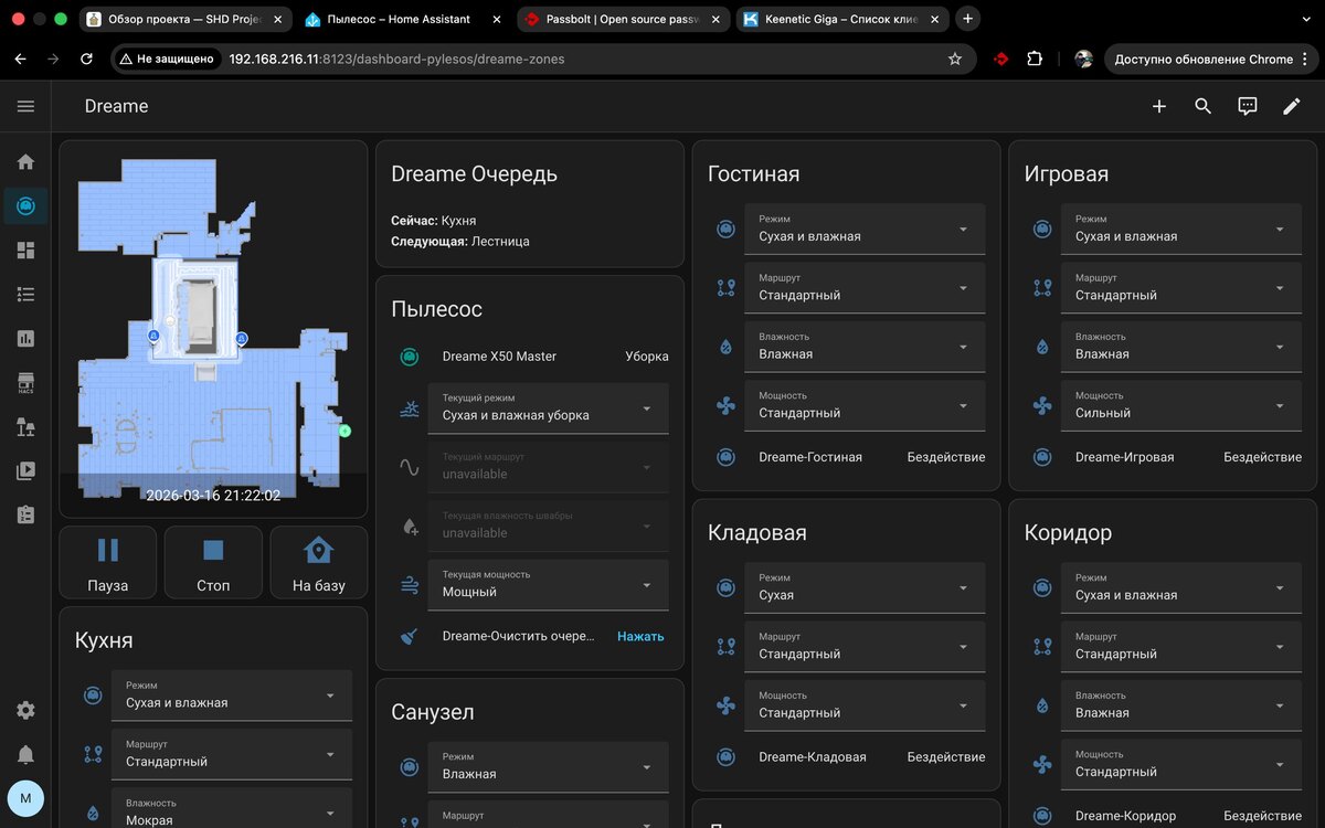 Традиционно подключение к пылесосу работает через готовые open-sourse интеграции, ибо в данном случае можно сделать своё, но зачем? Но, к сожалению, не все виды пылесосов можно подключить. Подавляющее большинство интеграций работают на базе Home Assistant. А вот логика уже полностью моя разработка. По карте уборки пылесоса получаю координаты нужных мне зон, для каждой зоны указываю параметры уборки и вывожу переключатели в Loxone, Алису и т.д., далее всё работает автоматически: 1. например, говорю: "Алиса, включи пылесос в кухне" и столовой и пылесос поедет уберется сначала с одними параметрами в кухню, затем в столовую 2. или ещё точечнее - говорю: "Алиса, включи пылесос в зоне готовки" и она едет убираться в кухню, в специально отведенную область с самыми мощными настройками. Не во всю кухню, а именно туда где человек готовит. Максимально удобный опыт получается. Всё ещё управляете пылесосом вручную? Тогда мы не идём к вам, вы - идите к нам)