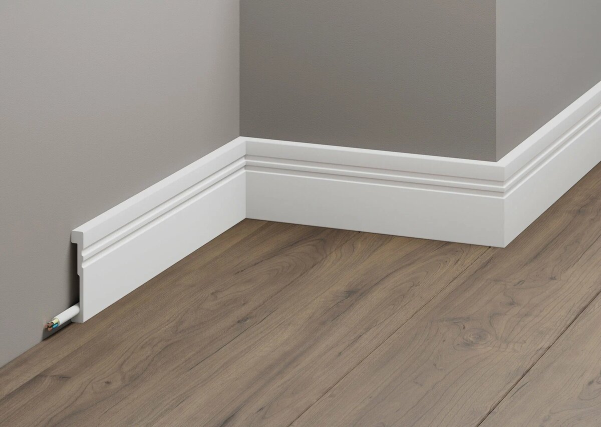 - Толщина: важно, чтобы плинтус был не толще дверного наличника (обычно 90–120 мм), иначе на стыке образуется некрасивый выступ.