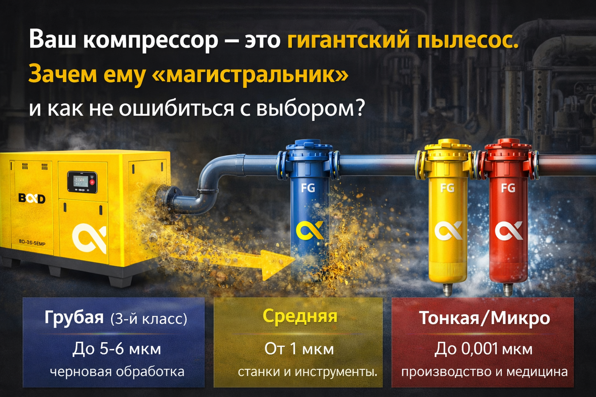 Многие владельцы производств уверены: если они купили дорогой безмасляный компрессор, то на выходе они автоматически получают стерильный воздух. Спешим вас расстроить — это опасное заблуждение. В этой статье разберем, почему воздух после компрессора часто напоминает «грязный коктейль» и как правильно подобрать магистральный фильтр, чтобы спасти оборудование от поломок. Компрессор: Пылесос, который работает наоборот По принципу работы любой компрессор можно сравнить с мощнейшим пылесосом. Он засасывает воздух из окружающей среды, сжимает его и отправляет в пневмосеть. В чем подвох? В обычном уличном или цеховом воздухе содержится пыль, частицы металлов, сажа и пары масла. При сжатии концентрация этой «грязи» увеличивается в разы. Факт: Согласно международному стандарту ISO 8573-1, в чистом воздухе должно быть менее 0,01 мг/куб.м масла. В обычном атмосферном воздухе загрязнений в 4 раза больше! Поэтому неважно, какой у вас агрегат — поршневой или винтовой, маслозаполненный или безмасл