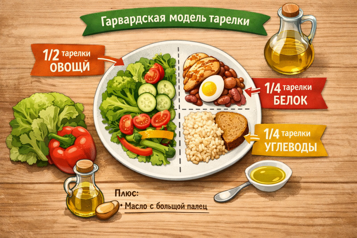 «Меньше» — это сколько? Меньше, чем полтазика? Или полведёрка? Чтобы не ходить в ресторан с калькулятором и не прикидывать «на глаз», есть более понятный ориентир — обычная тарелка. Это та самая гарвардская модель, где умные учёные всё уже разложили по местам: половина тарелки — овощи