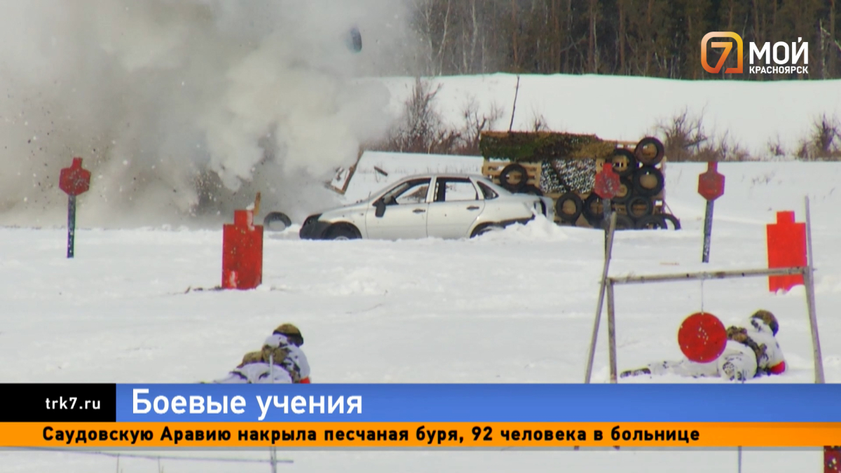 Стрельба по беспилотникам, БТР с силовой установкой и вертолёт, оснащённый взрывными снарядами. И это не сцена из голливудского боевика — так недалеко от Красноярска сегодня прошли военные учения. Наши бойцы практиковались в отражении вражеских атак. Учения такого масштаба, максимально приближённые к реальным, у нас провели впервые. Пули со свистом прорезают воздух и попадают точно в цель. Поражённый командным огнём «вражеский дрон» падает на землю и разлетается на куски от взрыва. Но противник не сдаётся и продолжает свою атаку. Чтобы застать врага врасплох, солдаты запрашивают огневую поддержку с воздуха. Вертолёт сбрасывает бомбы на вражеские укрытия, пока бойцы продолжают стрелять. Но пугаться не стоит. Ведь даже несмотря на то, что все взрывы и выстрелы настоящие, реальных врагов поблизости нет. Вместо них — только искусственные мишени и муляжи. Так в Красноярском крае сегодня прошли межведомственные военные учения. Для бойцов подготовили отработку в несколько этапов. Якобы диверс