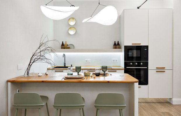 Фото: Дмитрий Шибаев Пространство организовано как двухкомнатная студия. На компактной площади разместились кухня-гостиная, отдельная спальня, прихожая и совмещенный санузел. Большой балкон-терраса площадью 11 кв. м разделен на две зоны: обеденную и зону отдыха. Основой палитры стал белый микроцемент, который сочетается с деревом трех пород: дуба, ореха и березы. Игра оттенков и разных фактур создает глубину и объем. Кухня линейной планировки оснащена всей необх