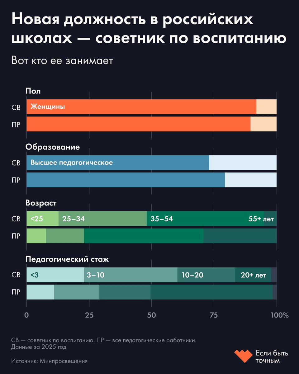 Минпросвещения рассчитывало, что к концу 2025 года советники появятся в 28 тысячах школ. Но на начало текущего учебного года занято около 15,5 тысячи ставок, а уникальных работников — только 12 тысяч, включая совместителей. Обязанности. В связке с завучем по воспитанию советник анализирует, планирует, разрабатывает программы профилактики «асоциального поведения». Также советник участвует в создании структур, призванных «формировать личность обучающихся», и продвигает предложения по укреплению их «гражданско-патриотической позиции».