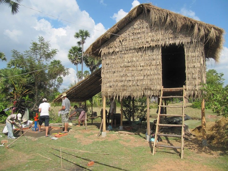 Традиционный сельский дом в Камбодже — это прямоугольное строение из дерева и бамбука с высокой соломенной крышей, которое почти всегда