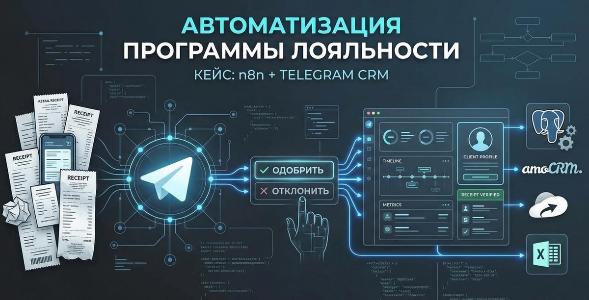 Как я автоматизировал программу лояльности: от хаоса с чеками до полноценной CRM в Telegram Точка А: Проблема (Потеря данных и рутина) Розничный бренд запустил программу лояльности: клиент покупает товар, регистрирует чек и получает расширенную гарантию или бонус. Как это работало раньше (ручной ад): Покупатели присылали фото чеков напрямую менеджерам в мессенджеры. Фотографии терялись в тоннах переписок. Контакты и данные клиентов перепечатывались в Excel руками — постоянно возникали опечатки в номерах. Скорость проверки была низкой, клиенты злились, а менеджеры выгорали от бесконечного копипаста. Задача: полностью исключить «человеческий фактор» на этапе сбора данных и автоматизировать документооборот. Инженерное решение: Архитектура на n8n Я спроектировал систему на базе Telegram-бота, n8n, PostgreSQL и AmoCRM. Бот полностью заменил первую линию поддержки, оставив менеджеру только одну кнопку — «Одобрить». Как работает логика (Скелет): Жесткая маршрутизация: Бот ведет пользователя