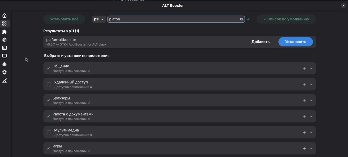 ~ ☄️Еее! ALTBooster залетел и в p11 ... Осталось дождаться самую свежую версию v5.6.9 😵😀🫡 Релиз v5.6.9 уже случился на GitHub: https://github.com/plafonlinux/altbooster/releases/tag/v.5.6.9 Установка v5.6.9 с GitHub: git clone https://github.com/plafonlinux/altbooster.git cd altbooster ./install.sh Сейчас в p11: Версия v.5.6.7 - Уже морально устаревшая, но ещё рабочая В Sisyphus: версия v.5.6.9 - Актуальный релиз epmi plafon-altbooster P.S. Спасибо огромноe @AlexanderShad за сборку всего необходимого для репозитория. Сам бы я никогда не справился! @plafon #altbooster