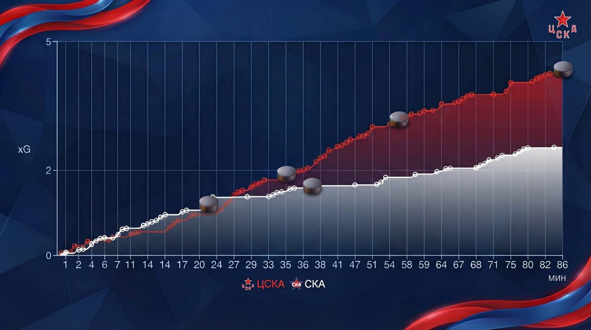 После первых тридцати минут видим увеличивающееся преимущество ЦСКА. Цифры наглядно иллюстрирует происходящее. Помимо контроля на протяжении практически всего матча, к концовке основного времени и в овертайме добавили в конкретике. Запас при игре с шайбой на следующие матчи серии как раз дать стабильно не только количество, но и качество атак при еще большем объеме катания в чужой зоне.