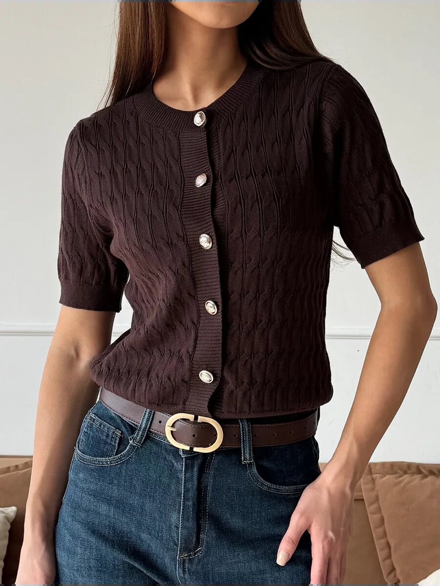 Короткий кардиган из вязаного трикотажа с фактурным узором «косы». Круглый вырез, короткие рукава, ряд декоративных пуговиц по центру. Плотная посадка по фигуре.