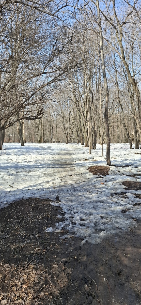 Плюс снежный покров между деревьями окончательно пришел в негодность (не растаял полностью, но проваливался, а внутри - грязюка). Так что гулять я могла только по асфальтированным аллеям. Среди большого количества людей, как бы снабженных громкоговорителями.