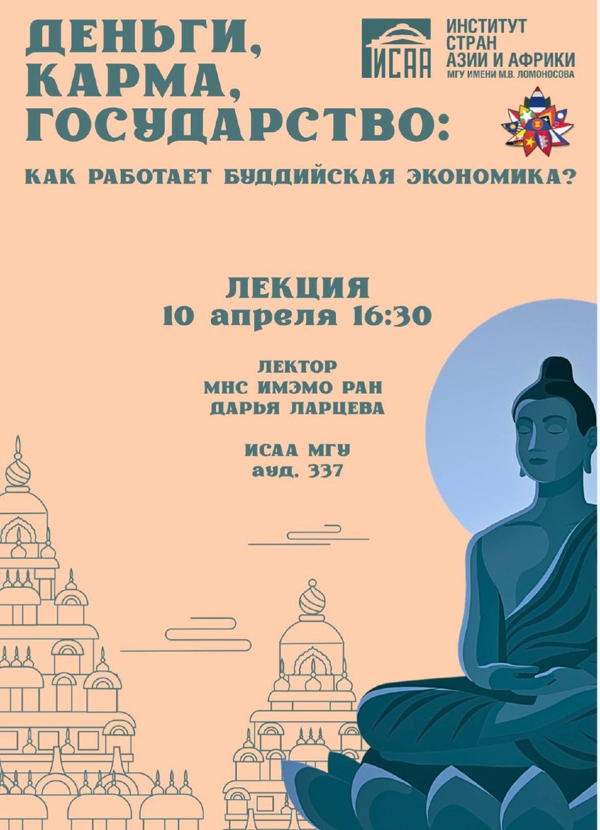 Как деньги, карма и государство переплетаются в буддийской экономике? Существует ли альтернативная модель хозяйствования, основанная на духовных практиках? Приглашаем вас на лекцию Дарьи Ларцевой — младшего научного сотрудника ИМЭМО РАН, выпускницы ИСАА МГУ, которая расскажет о том, как буддизм влияет на экономическое развитие на примере Таиланда. 🔹 Что такое буддийская экономика и почему она привлекает внимание исследователей. 🔹 Как концепция кармы и религиозные установки буддизма сочетаются с современными экономическими реалиями. 🔹 Механизмы взаимодействия духовных практик и экономического развития в Таиланде. 🔹 Роль государства в поддержании буддийской экономической модели. отношений. Форма для регистрации: https://forms.yandex.ru/cloud/69c292ea02848f379981f321 (По предварительной регистрации и предъявлению паспорта РФ) Где 🗺: аудитория 337 ИСАА МГУ Москва, ул. Моховая, 11, стр. 1 Когда 📆: 10 апреля в 16:30