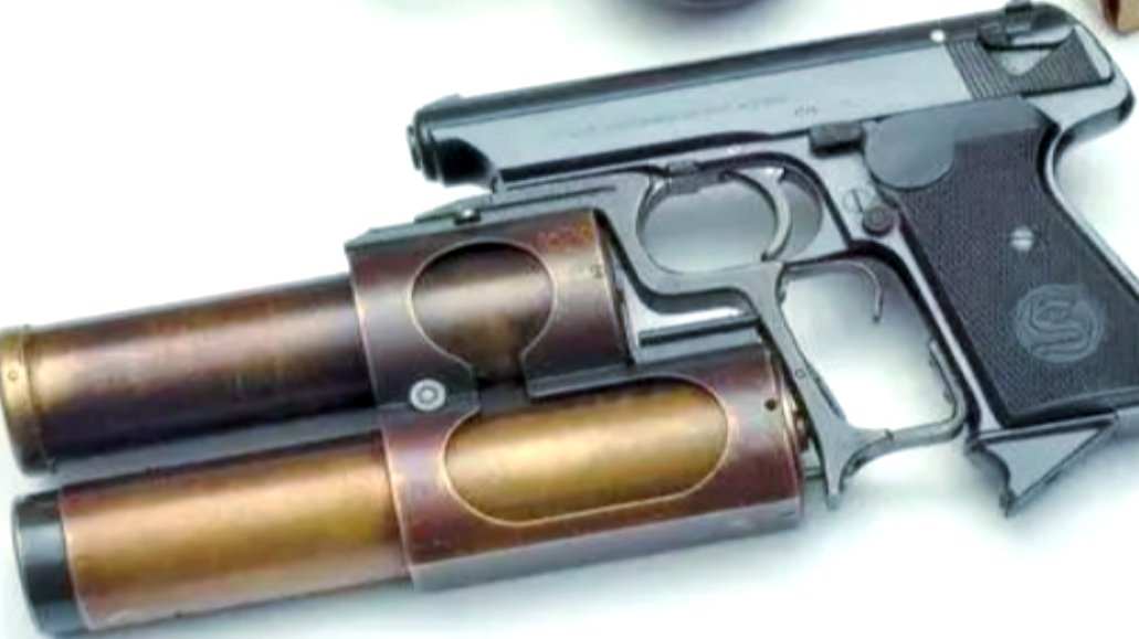 Среди десятков типичных «шмайсеров» и «парабеллумов» работники комиссии обнаружили пистолет с каким-то блоком спереди, похожий на миниатюрный гранатомёт. Тяжёлый, неудобный, с фонарём, который сжигает батареи всего за сорок минут.