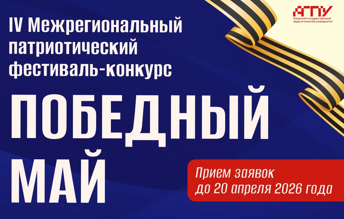 » ➡️ ФГБОУ ВО «Азовский государственный педагогический университет им. П.Д. Осипенко» проводит IV Межрегиональный патриотический фестиваль-конкурс «Победный май». Цель — возрождение исторической правды и сохранение памяти о событиях Великой Отечественной войны, а также содействие решению актуальных задач патриотического воспитания и формированию традиционных российских духовно-нравственных ценностей. 🔖 Фестиваль-конкурс проходит в следующих номинациях: — Литературно-творческая «Строки, опаленные войной» (стихотворение, авторское стихотворение, монолог); — Вокальная/инструментальная «Голос Победы: песни, которые помнит сердце»; — Хореографическая «Танец победного мая»; — Театрального искусства «Память поколений» (постановка, этюд, пластический номер); — «Когда мы едины, мы непобедимы». 📌 Подать заявку можно до 20 апреля 2026 года по форме. 📎 Подробнее — в положении. 👻 MAX|💙ВК|📝Дзен|🤩Сайт #МГУимениКуинджи