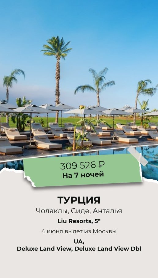 👋 Место, где встречаются стиль, вкусная еда и сервис✨ Если тебе нравится бохо-стиль, ты любишь пробовать что-то вкусное и считаешь, что лучший отдых — просто лежать у моря и никуда не спешить, у меня есть отличная новость. Кажется, мы нашли настоящий маленький рай. ✈️ Москва → Турция, Чолаклы, Сиде, Анталья 📅 04.06 на 🌙 7 ночей 🌴 Liu Resorts, 5* 🛌 Deluxe Land View, Deluxe Land View Dbl 🍽 UA 🔥 от 309 526 RUB Подробнее здесь: https://qui-quo.ru/JJ17-QP23 Вопросы/ответы сюда👇 https://t.me/KomarovaLarisa Ваш 😍❤️ Тревел Эксперт Лариса Комарова МЫ В МАХ ПРИСОЕДИНЯЙТЕСЬ НАШ САЙТ https://easytravelagency.ru/ Запрещенка https://www.instagram.com/l.komarova1?igsh=aWdkc3VuZH