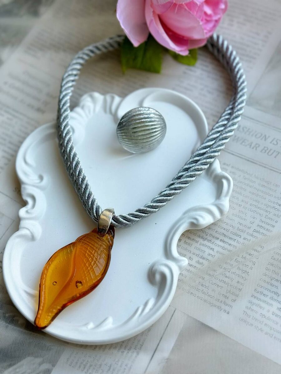 🌞 Эта подборка — настоящее воплощение курортного настроения и природной гармонии. Фактурная подвеска в виде ракушки из теплого, медово-янтарного муранского стекла на мягком витом шнуре серебристого оттенка притягивает взгляды и наполняет образ светом. Дополняет композицию лаконичное кольцо-сфера с дымчатыми переливами, поддерживая серебряную гамму. Такой акцентный сет требует лаконичного фона, чтобы раскрыть всю свою красоту, носите его с белоснежной льняной рубашкой или базовой футболкой, они станут идеальным холстом для яркой янтарной ракушки. Серебристый шнур добавит прохлады и лоска.✨ Колье 5700 Кольцо 4080 ✨Нажмите для заказа ✉️ Нажмите чтобы задать вопрос