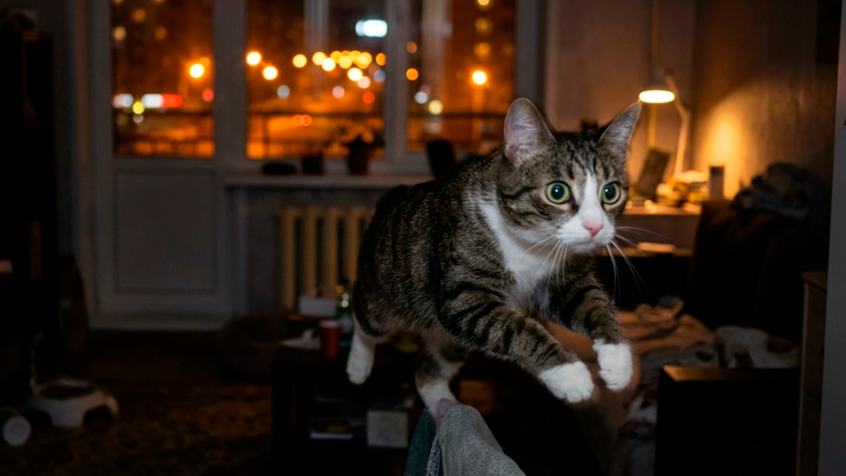 Когда вы встаёте "разобраться", разговариваете, гладите или играете, кот получает внимание именно в тот момент, который вам неудобен. Со временем ночные гонки становятся для него способом "включить вас", и проблема усиливается, потому что вы сами подкрепляете поведение.