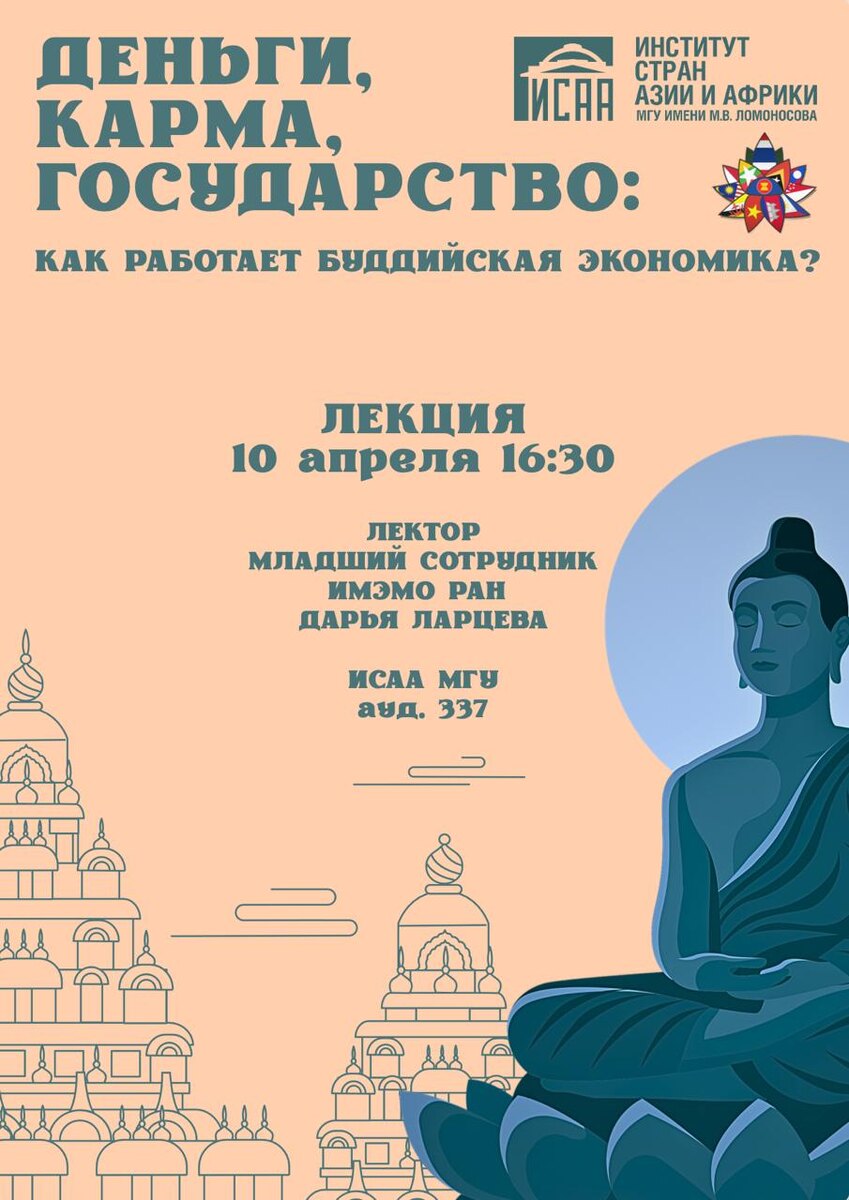 Как деньги, карма и государство переплетаются в буддийской экономике? Существует ли альтернативная модель хозяйствования, основанная на духовных практиках? Приглашаем вас на лекцию Дарьи Ларцевой — младшего научного сотрудника ИМЭМО РАН, выпускницы ИСАА МГУ, которая расскажет о том, как буддизм влияет на экономическое развитие на примере Таиланда. 🔹 Что такое буддийская экономика и почему она привлекает внимание исследователей. 🔹 Как концепция кармы и религиозные установки буддизма сочетаются с современными экономическими реалиями. 🔹 Механизмы взаимодействия духовных практик и экономического развития в Таиланде. 🔹 Роль государства в поддержании буддийской экономической модели. отношений. Форма для регистрации: https://forms.yandex.ru/cloud/69c292ea02848f379981f321 (По предварительной регистрации и предъявлению паспорта РФ) Где 🗺: аудитория 337 ИСАА МГУ Москва, ул. Моховая, 11, стр. 1 Когда 📆: 10 апреля в 16:30