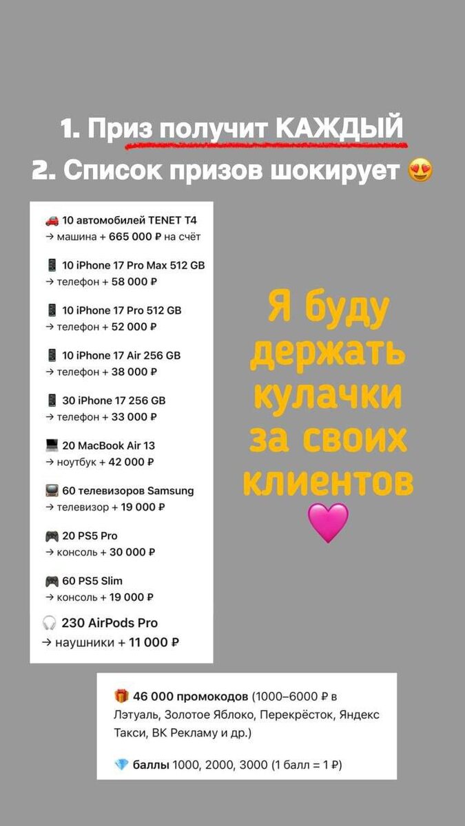 😱 Когда вчиталась в официальные правила акции «50 000 призов» для предпринимателей — у меня глаза на лоб полезли. Смотрите сами (документ приложила ниже постом👇): Что разыгрывают и сколько: 🚗10 автомобилей TENET T4 → машина + 665 000 ₽ на счёт 📱 10 iPhone 17 Pro Max 512 GB → телефон + 58 000 ₽ 📱 10 iPhone 17 Pro 512 GB → телефон + 52 000 ₽ 📱 10 iPhone 17 Air 256 GB → телефон + 38 000 ₽ 📱 30 iPhone 17 256 GB → телефон + 33 000 ₽ 💻 20 MacBook Air 13 → ноутбук + 42 000 ₽ 📺 60 телевизоров Samsung → телевизор + 19 000 ₽ 🎮 20 PS5 Pro → консоль + 30 000 ₽ 🎮 60 PS5 Slim → консоль + 19 000 ₽ 🎧 230 AirPods Pro → наушники + 11 000 ₽ 🎁 46 000 промокодов (1000–6000 ₽ в Лэтуаль, Золотое Яблоко, Перекрёсток, Яндекс Такси, ВК Рекламу и др.) 💎 баллы 1000, 2000, 3000 (1 балл = 1 ₽) Как участвовать: 1⃣ Открыть счёт для бизнеса до 29 марта 2⃣ Подключить любой пакет услуг (кроме «Нотариус») 3⃣ Нажать на кнопку УЧАСТВУЮ 4⃣ Сделать покупку от 1000₽ бизнес-картой 5⃣ 6–12 апреля к