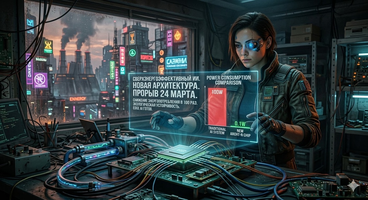 24 марта стало знаменательной датой в истории вычислительной техники. Команда инженеров объявила о создании принципиально новой аппаратной архитектуры для систем искусственного интеллекта, которая способна обрабатывать данные, потребляя почти в 100 раз меньше электроэнергии по сравнению с существующими стандартами. Этот прорыв происходит на фоне глобальной обеспокоенности стремительным ростом энергопотребления серверных ферм по всему миру. Последние несколько лет развитие искусственного интеллекта, особенно больших языковых моделей (LLM) вроде GPT, шло по пути масштабирования: больше данных, больше параметров, больше вычислительной мощности. Это привело к экспоненциальному росту аппетита центров обработки данных (ЦОД). Традиционные процессоры (CPU) и даже специализированные графические чипы (GPU), доминирующие на рынке ИИ, построены на архитектуре фон Неймана, где память и вычислительный блок разделены. Огромное количество энергии тратится просто на перемещение данных между этими блока