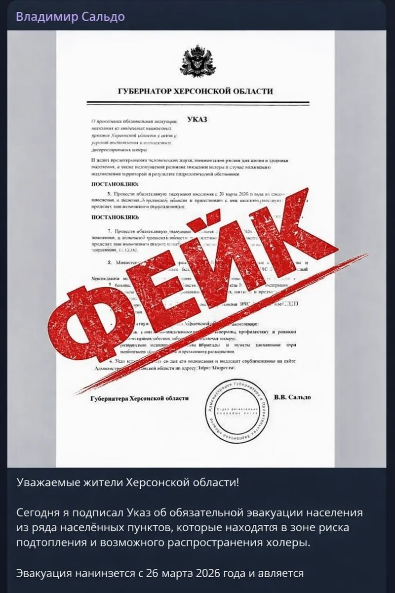 Губернатор Херсонской области Владимир Сальдо заявил, что распространяемый в сети указ об обязательной эвакуации жителей региона из-за угрозы подтопления и холеры является фейком.. «Официально заявляю: это грубо сделанная подделка. Несоответствие формулировок, стилистики официальных документов и порядка принятия решений. Никаких указов об обязательной эвакуации в Херсонской области не издавалось. Гидрологическая и эпидемиологическая обстановка стабильная — угроз подтопления и холеры нет», — подчеркнул Сальдо в своём Telegram-канале. 🎥Южная служба новостей