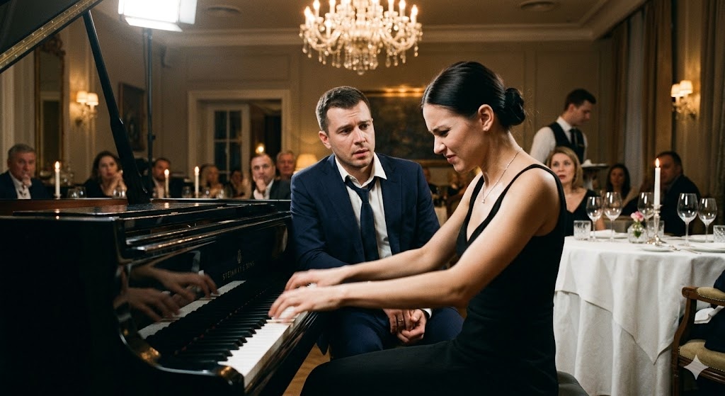 Она не остановилась. Диана мгновенно подхватила его партию, переложив аккорды так, что отсутствие второго игрока никто не заметил. Теперь она играла одна, заполнив собой весь зал, вытеснив из него звон бокалов, запах еды, шепотки и самодовольный смех.