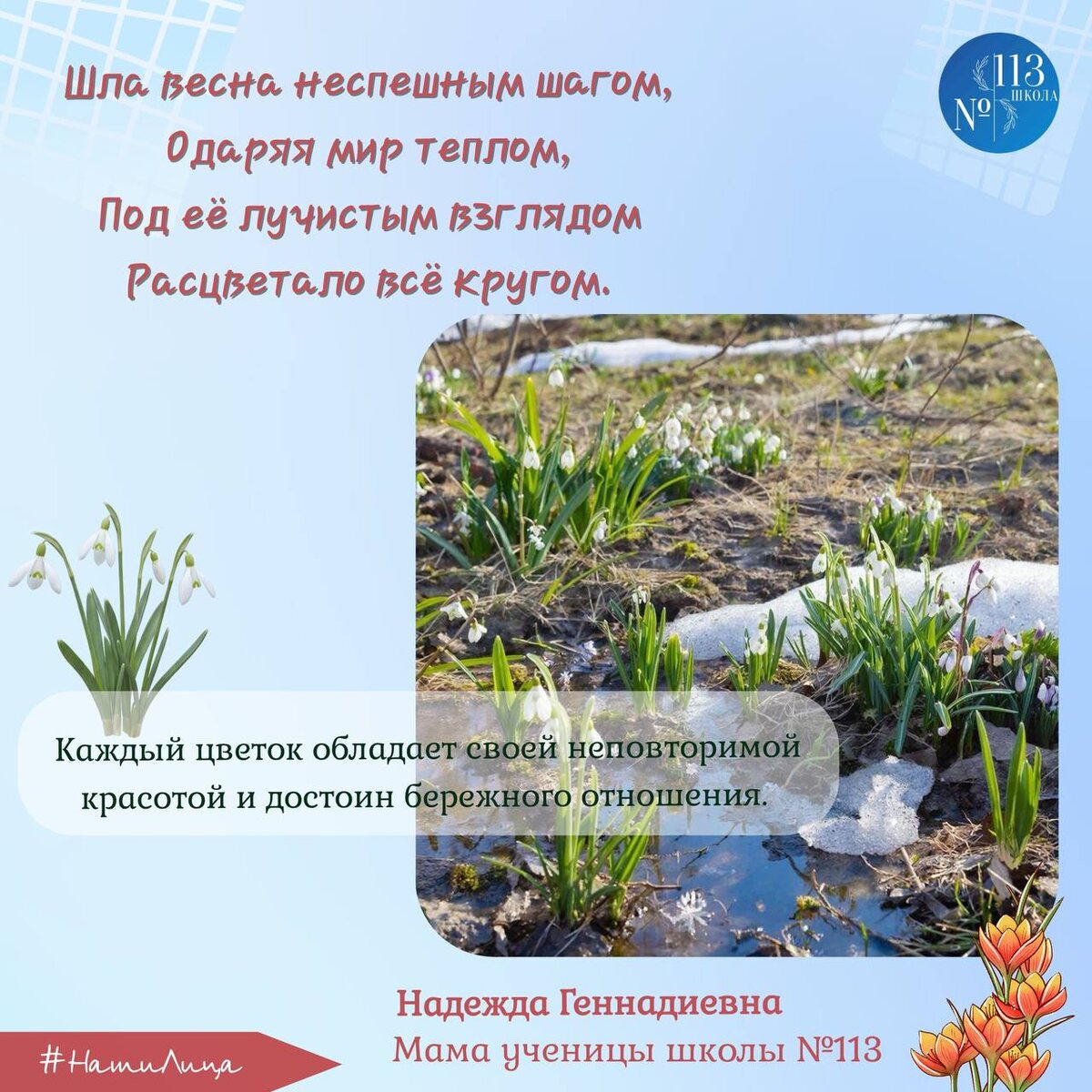 , Одаряя мир теплом, Под её лучистым взглядом Расцветало всё кругом. 💬Здравствуйте! Вас приветствует мама нашей ученицы, Надежда Геннадиевна. Как только на отдельных участках сходит снег, сразу же появляются первые цветочки. Это первоцветы – удивительные растения! Полюбуйтесь ими. Невероятно трогательно выглядит ландыш, прострел раскрытый или сон-трава, молодые стебли, листья и бутоны которого покрыты серебристыми волосками. К сожалению человек без меры пользуется богатствами природы. И теперь в нашем мире многие растения почти исчезли. 😍Каждый цветок обладает своей неповторимой красотой и достоин бережного отношения. Давайте все вместе сохраним эту красоту. 🙌Каждый может внести свой вклад в сохранение окружающей среды, отказываясь от сбора растений. Ты не тронь и не рви цветы! Пусть подольше радуют глаз. Полюбуйся и мимо пройди, Сохрани красоту для всех нас! #ДОНМ #Школа113 #НашиЛица