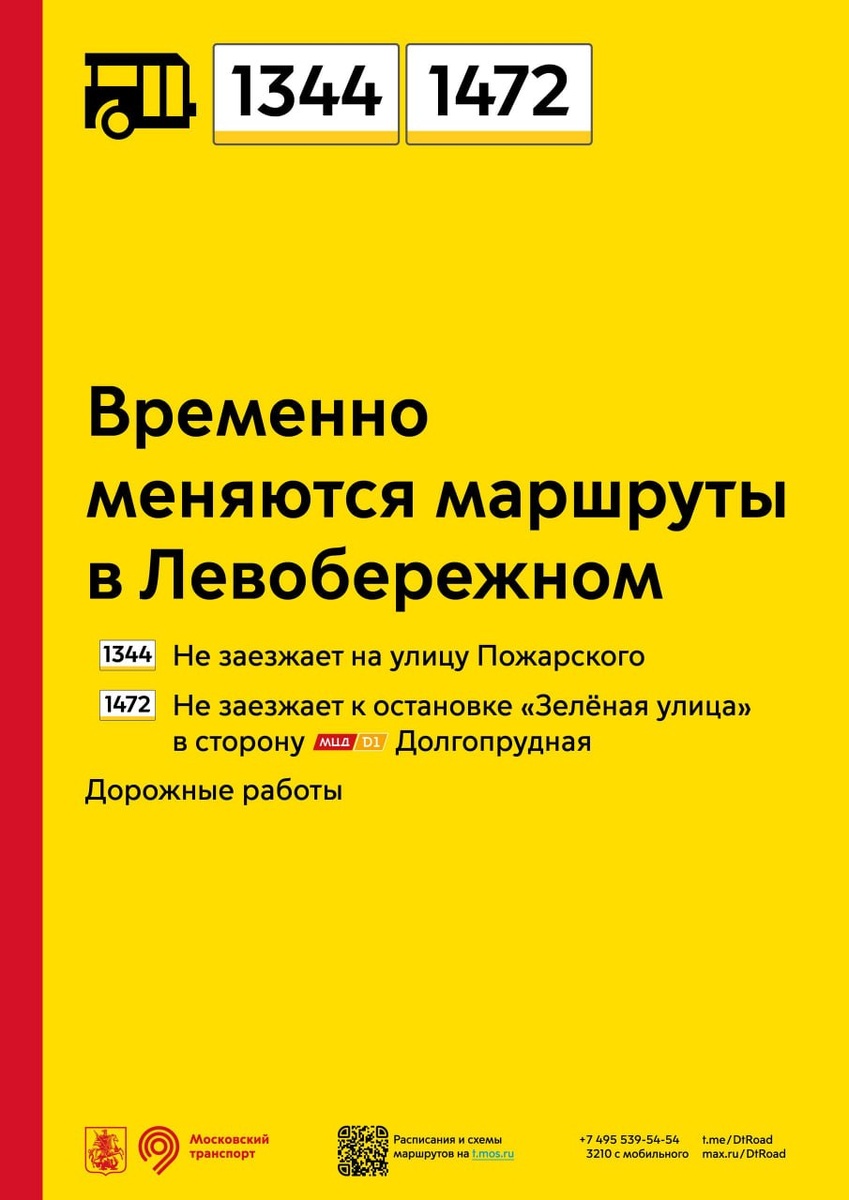 ! ДОРОЖНИКИ ХИМОК УНИЖАЮТ ПОЖИЛЫХ И ТЕХ, КОМУ ТРУДНЕЕ ХОДИТЬ. В связи с затруднением проезда автобусов на отдельных участках маршрутов 1344 и 1472, движение автобусов на территории г.о. Химки временно изменено. Маршруты временно меняются в Левобережном. 🔹 Маршрут 1344 не заезжает на улицу Пожарского. 🔹 Маршрут 1472 не заезжает к остановке «Зеленая улица» в сторону МЦД Долгопрудная. Это связано с неудовлетворительным состоянием дорожного полотна и проведением соответствующих дорожных работ. Изменения носят вынужденный характер, над решением ситуации уже работают областные службы. Трасса маршрутов будет восстановлена после окончания работ, об этом сообщим дополнительно, — сообщает Дептранс Москвы. 📱 ХИМКИGO — наш базовый канал. 📱 MAX В ХИМКИGO