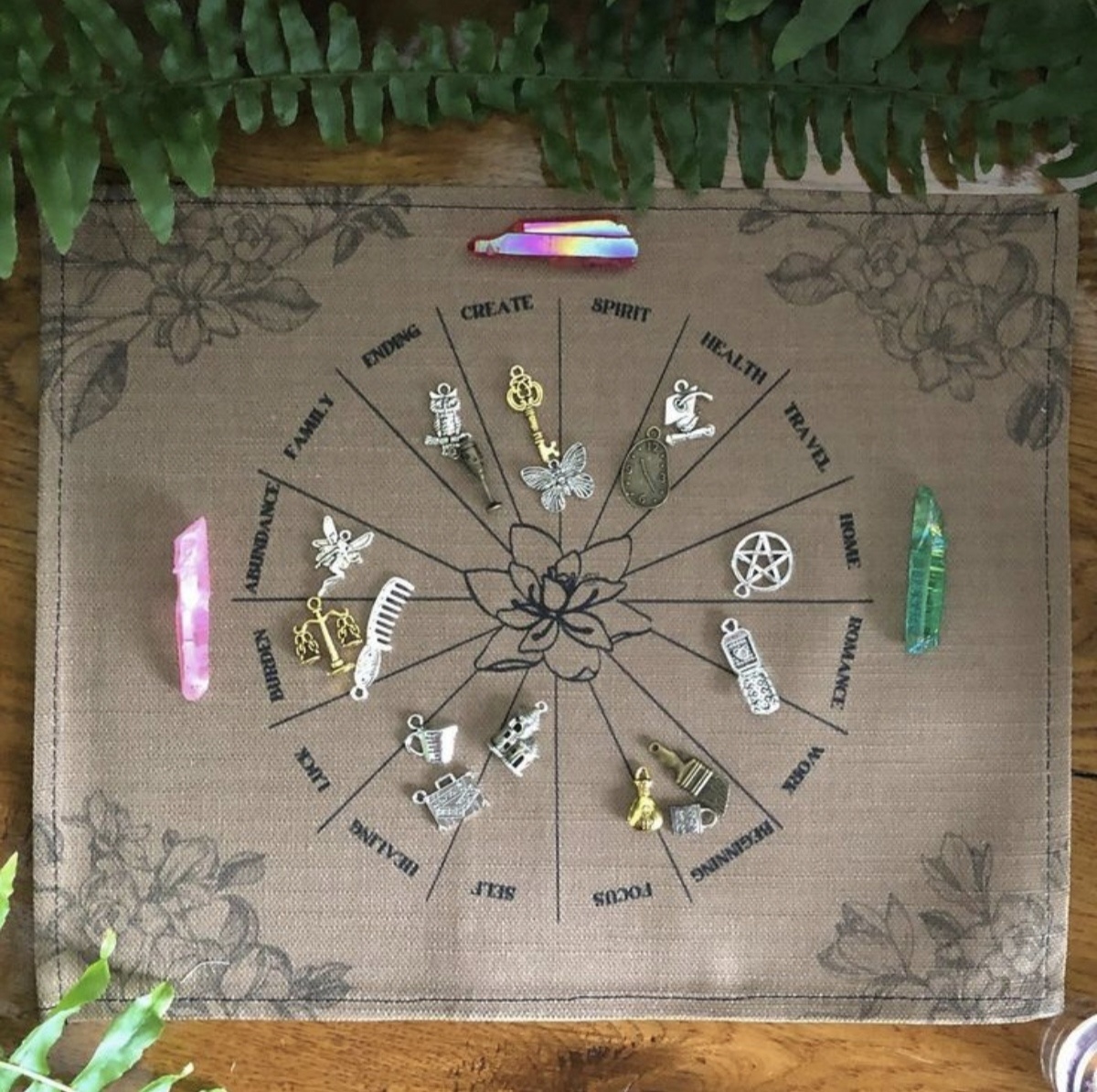 Как‑то я уже писала об одном необычном способе гадания и даже моделировала возможности полного запрета гаданий в том виде, в каком они есть сейчас («Часть 1» и «Часть 2»). Но не так давно в ленте Pinterest (который, вроде, ещё не запрещён) я наткнулась на довольно интересный способ гадания. Берётся лист бумаги или ткань с особой разметкой. Сектора могут быть любыми: чакры, зодиакальный круг, различные сферы жизни. Такие разметки обычно используются для гадания на рунах, камнях и даже на костях мелких животных. Не знаю, насколько эффективен последний вариант и часто ли он используется в наше время, я слышала о подобном способе гадания очень давно и считаю его как не особо гуманным, так и не очень эстетичным. В этом же случае на разметку бросают шармы — те самые подвески, которые используют в рукоделии. Состав набора может быть любым — всё зависит от предпочтений и личных ассоциаций. Ведь в таком случае толкование таких символов у каждого будет проходить по‑своему. Именно в этом огромный
