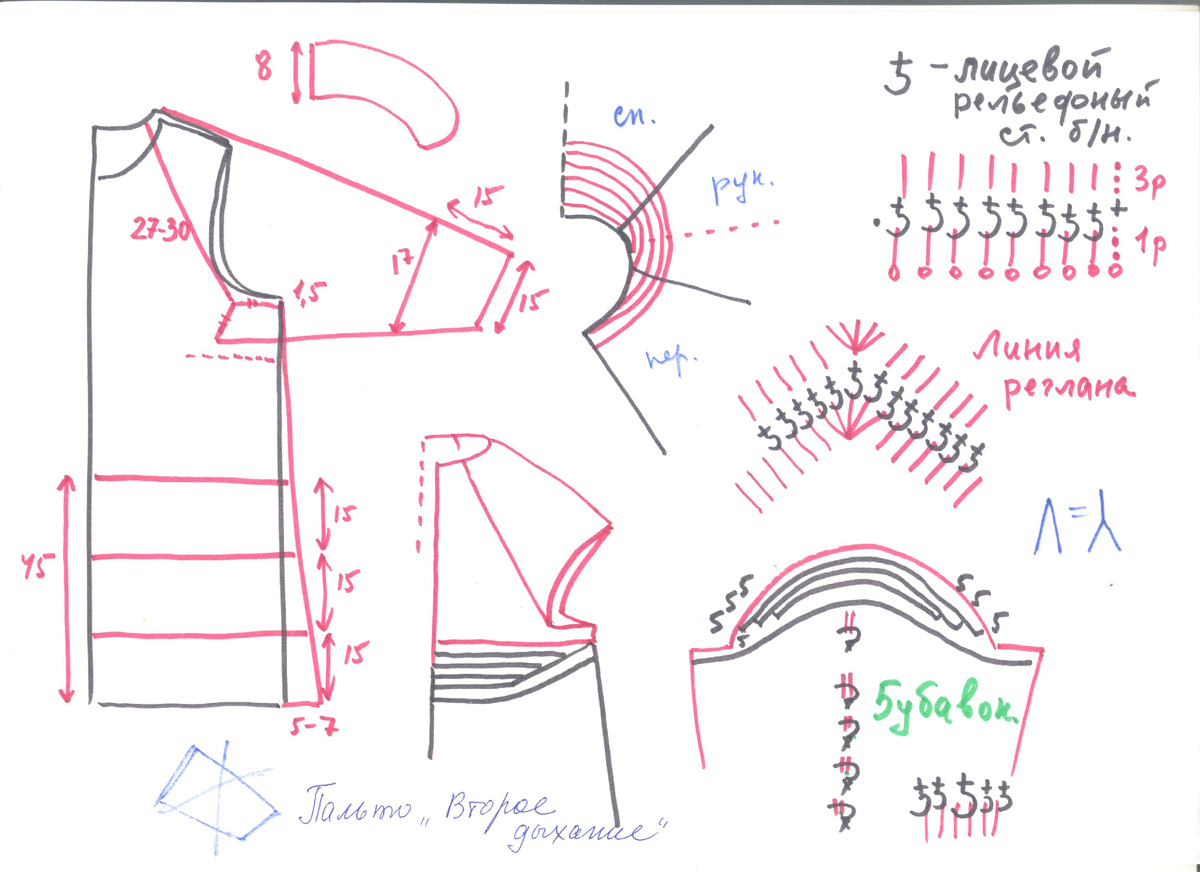 Вяжите лиф с рукавом реглан от горловины. Постройте выкройку на основе выкройки с втачным рукавом. Сделайте отдельно выкройку "кокетки" с укороченными рядами. Для основной вязки используйте полотно, где лицевые ряды из столбиков с накидом. Изнаночные ряды вяжите столбиками без накида лицевым рельефным способом. Делайте прибавки по линии реглана только в лицевых рядах из столбиков с накидом. В ряду из столбиков без накида провяжите цепочку из воздушных петель, соединяя полоски и спинку, оставляя в стороне рукава. Количество петель цепочки из воздушных петель зависит от размера фигуры. Отметьте условный боковой шов. На полосках сделайте нагрудные вытачки укороченными рядами. Если необходимо сделай