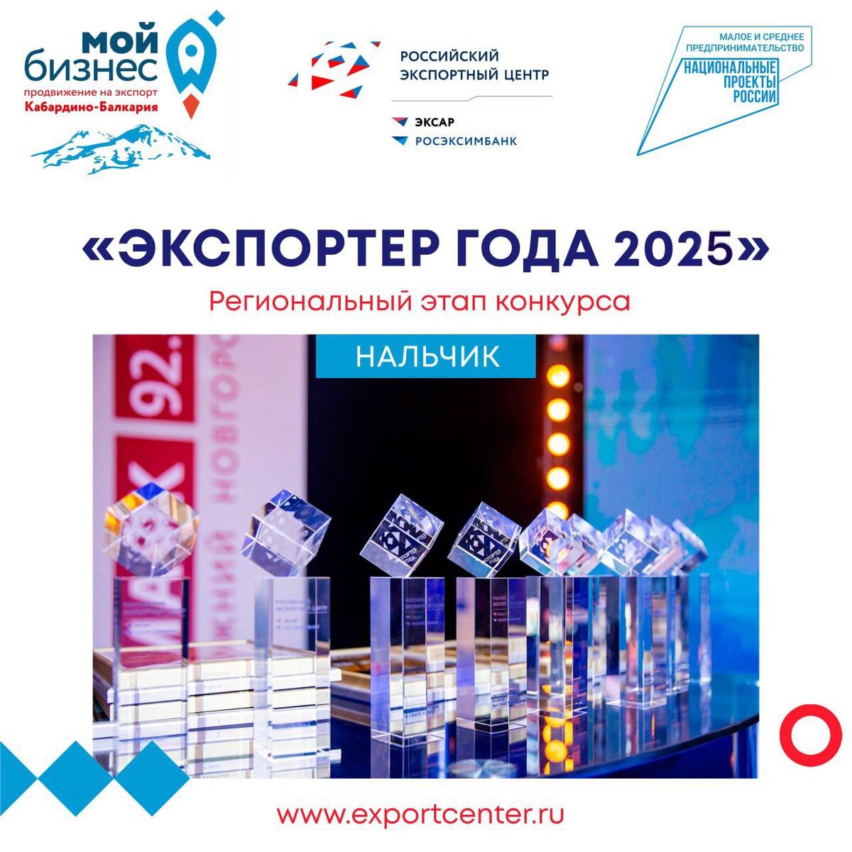 «Экспортер года» - крупнейшее профильное мероприятие для МСП – экспортеров, всероссийская премия в области международной кооперации и экспорта. В конкурсе приняли участие экспортеры из числа субъектов МСП, которые зарегистрированы и осуществляют деятельность в КБР. За исключением победителей регионального этапа конкурса «Экспортер года 2024». -номинация «Экспортер года в сфере промышленности»: Победитель – ООО «Техно-Алмаз» -номинация «Экспортер года в сфере пищевой промышленности»: Победитель – ООО «Сириус М» -номинация «Экспортер года в сфере агропромышленного комплекса»: Победитель – ООО «Гибрид СК» -номинация «Экспортер года в сфере высоких технологий»Победитель – ООО «Корпорация ДНК» -номинация «Прорыв года»: Победитель - ООО «Садкомплект» -номинация «Лучшая женщина экспортер»:Победители – ООО «ТИС» Региональный этап конкурса на соискание премии организуется Центром «Мой бизнес» КБР при содействии Минэкономразвития КБР.