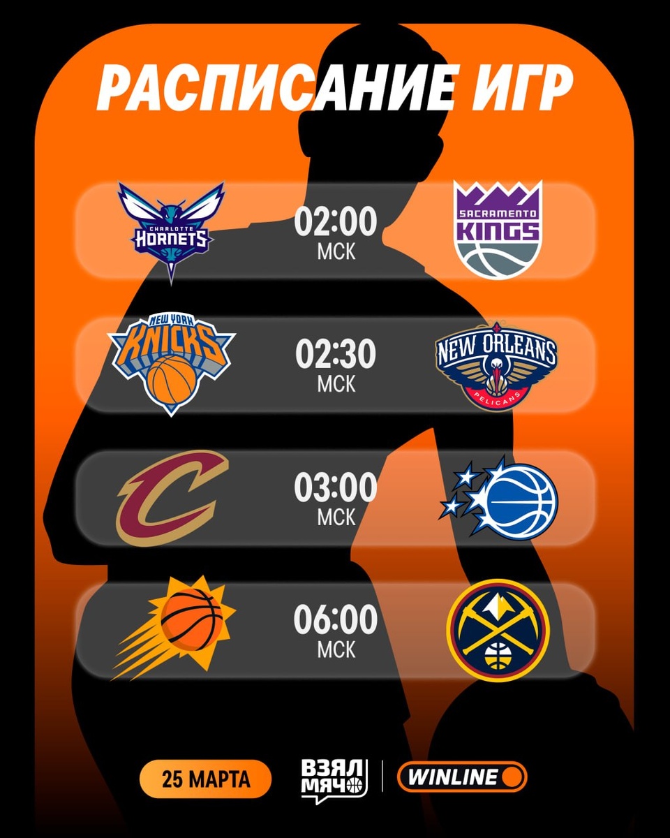 ! Нас ждут игры крутых команд Востока, а утром Абакайзер прокомментирует для вас зарубу за место в плей-офф на Западе. Трансляции абсолютно всех игр смотрите в нашей группе ВК 👈🏼 02:00 | Шарлотт — Сакраменто 🎙 Матвей Юдкин 02:30 | Нью-Йорк — Новый Орлеан 🎙 Артём Тихонов 03:00 | Кливленд — Орландо 🎙 Дмитрий Хамидулин 06:00 | Финикс — Денвер 🎙 Сергей Абаев 🏀 ПОДПИШИСЬ — ЗДЕСЬ ЖИВЁТ БАСКЕТБОЛ!