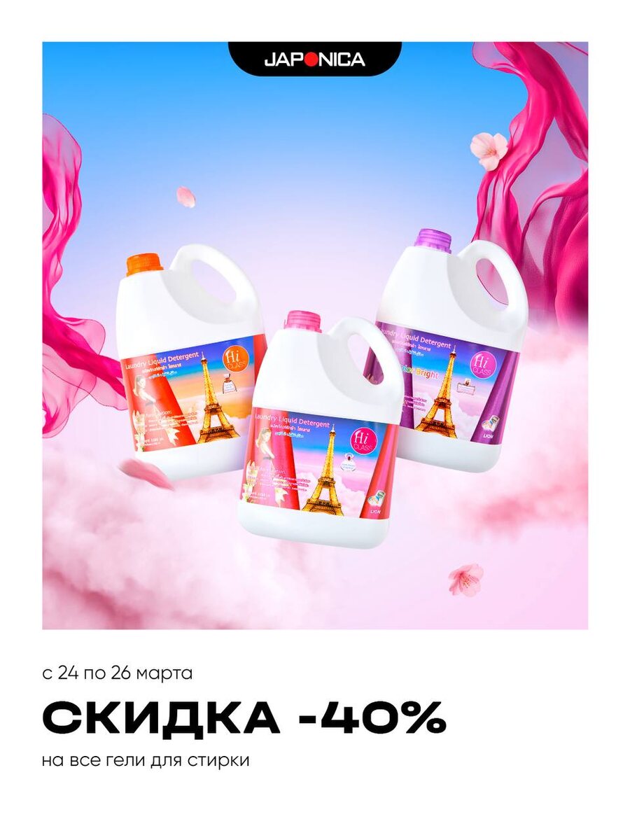 🧺 С 24 по 26 марта действует скидка 40% на все гели и жидкие средства для стирки на shop.japonica.ru 🛒 Большой выбор для ухода за любыми тканями: ▫️Для белого и светлого белья ▫️Для тёмного и чёрного белья ▫️Для цветного белья ▫️Для спортивной одежды ▫️Для деликатных тканей