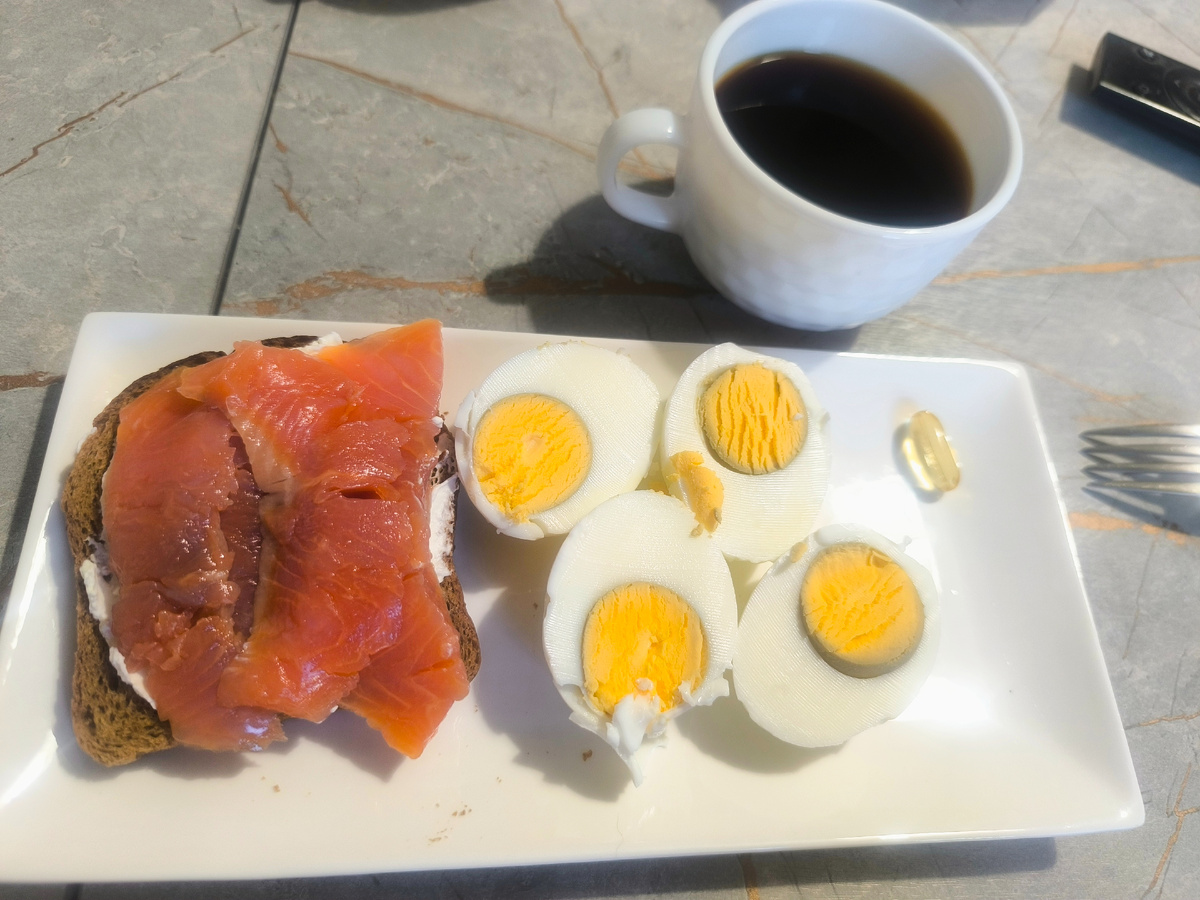 Тост с творожным сыром +слабосолёная форель . Яйцо вареное. Кофе молотый.+омега 3.