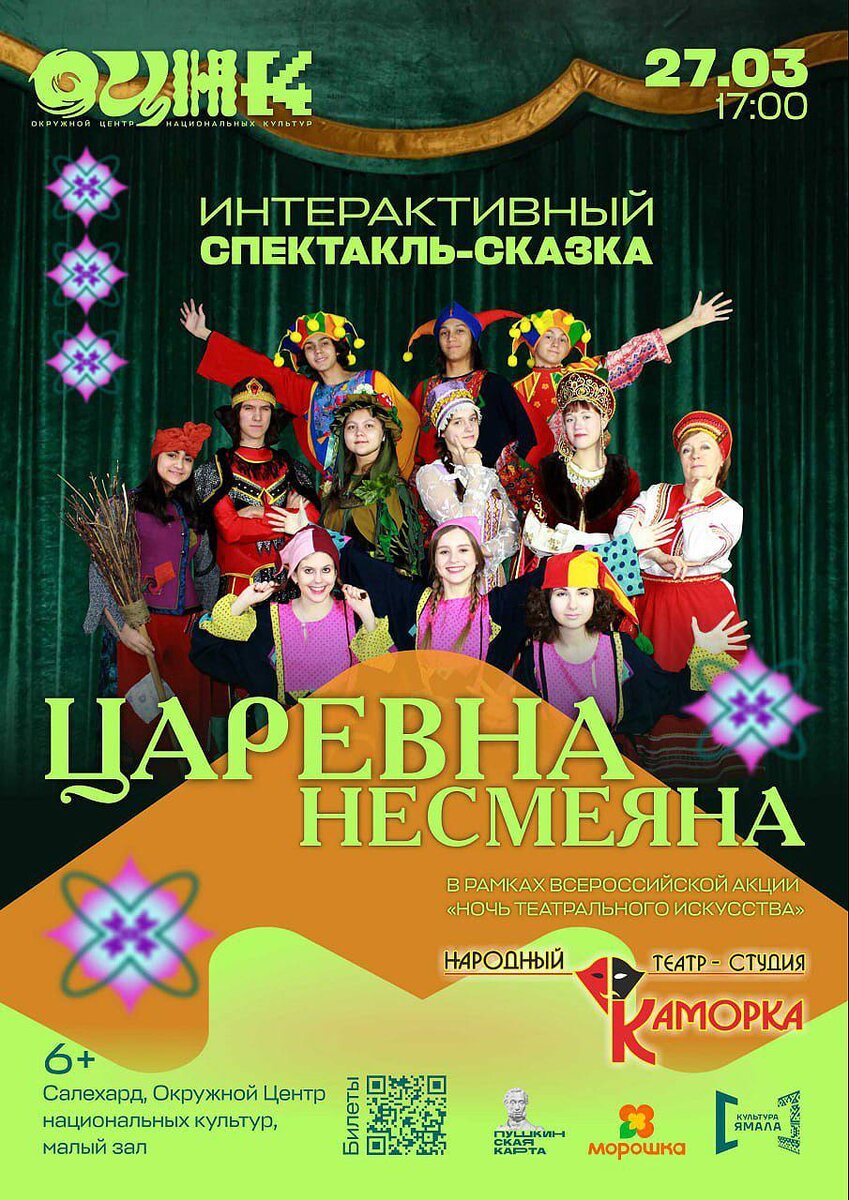 ! Вместе с любимыми героями вы отправитесь в захватывающее приключение, полное загадок, забавных ситуаций и неожиданных поворотов, чтобы вернуть царевне ее сияющую улыбку и отличное настроение. Билеты доступны по ссылке, по Пушкинской карте или через сервис «Морошка» со скидкой 20% Ждем вас 27 марта в 17:00 в Окружном Центре национальных культур! 👍 в ВК | МАХ