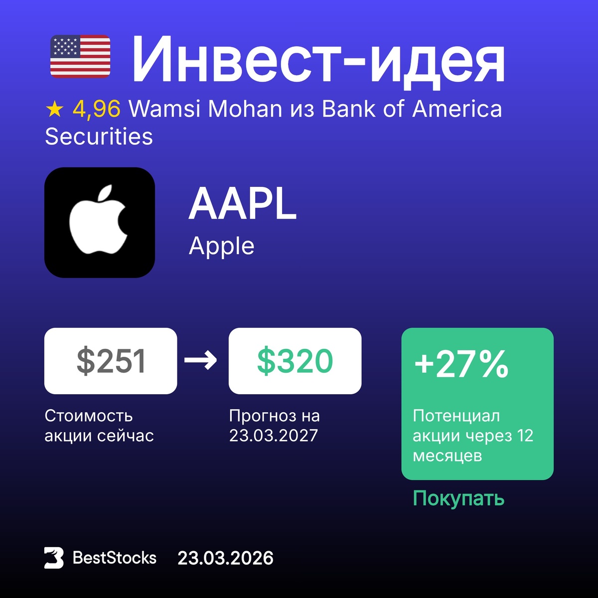 Π’ΠΈΠΊΠ΅Ρ: AAPL ΠΡΠΎΠ³Π½ΠΎΠ·Π½Π°Ρ ΡΠ΅Π½Π°: $320 (+27%) Π Π΅ΠΊΠΎΠΌΠ΅Π½Π΄Π°ΡΠΈΡ: ΠΠΎΠΊΡΠΏΠ°ΡΡ InvestRank Π°ΠΊΡΠΈΠΈ: 6 ΠΈΠ· 10 ΠΡΠΎΠ³Π½ΠΎΠ· ΡΠ΄Π΅Π»Π°Π½: 23.03.2026 ΠΡΠΎΠ³Π½ΠΎΠ· Π΄ΠΎ: 23.03.2027 ΠΠ½Π²Π΅ΡΡ-ΠΊΠΎΠΌΠΏΠ°Π½ΠΈΡ: Bank of America Securities ΠΠ½Π°Π»ΠΈΡΠΈΠΊ: Wamsi Mohan ΠΡΡ ΡΠ΅ΠΊΠΎΠΌΠ΅Π½Π΄Π°ΡΠΈΠΈ Π½Π° ΡΠ΅Π³ΠΎΠ΄Π½Ρ β β’β’β’β’β’ π― ΠΡ Π·Π½Π°Π»ΠΈ, ΡΡΠΎ Π² ΡΠ°Π·Π΄Π΅Π»Π΅ Ρ ΠΊΡΠΈΠΏΡΠΎΠ²Π°Π»ΡΡΠ°ΠΌΠΈ ΠΌΠΎΠΆΠ½ΠΎ ΡΠ·Π½Π°ΡΡ ΡΠ΅Π½Ρ, Π΄ΠΈΠ½Π°ΠΌΠΈΠΊΡ ΠΈ ΠΊΠ»ΡΡΠ΅Π²ΡΠ΅ ΠΏΠΎΠΊΠ°Π·Π°ΡΠ΅Π»ΠΈ ΠΏΠΎ ΠΊΠ°ΠΆΠ΄ΠΎΠΉ ΠΈΠ· Π΄ΠΎΡΡΡΠΏΠ½ΡΡ