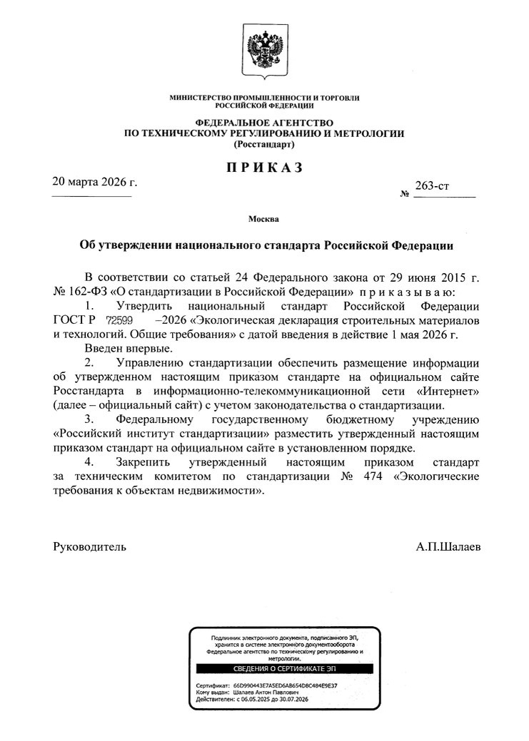 ❗️ Приказом Росстандарта № 263-ст от 20 марта 2026 года утверждён национальный стандарт ГОСТ Р 72599-2026 «Экологическая декларация строительных материалов и технологий. Общие требования». Стандарт разработан в рамках деятельности Технического комитета «Экологические требования к объектам недвижимости» (ТК 474). Дата введения стандарта в действие — 1️⃣ мая 2026 года. Требования стандарта направлены на снижение негативного воздействия на окружающую среду за счет применения механизма добровольного информирования об экологических аспектах продукции – экологических деклараций типа III. Стандарт устанавливает единообразие средств и методов представления экологических деклараций с применением модульного подхода к структуре жизненного цикла строительной продукции, а также общие требования к экологической декларации продукции. Стандарт гармонизирован с актуальными международными стандартами ISO 21930 и EN 15804. Экологическая декларация является одним из видов экологической маркировки тов