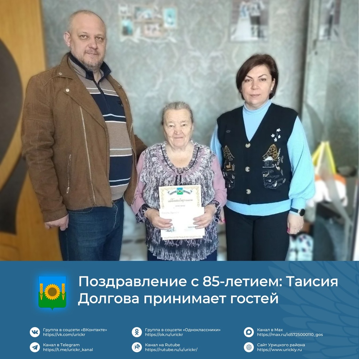 В этот знаменательный день Таисия Ивановна принимала теплые поздравления от глава Архангельского сельского поселения Константина Перелыгина, руководителя КЦСОН Тамары Тесиной, специалиста КЦСОН по социальной работе Ирины Зуевой. В честь юбилея ей вручили поздравительное письмо Президента Российской Федерации, благодарственное письмо главы Урицкого района и памятный сувенир. От всей души поздравляем Таисию Ивановну с этим прекрасным юбилеем! Желаем крепкого здоровья, счастья и благополучия на многие годы! #УрицкийРайон #АдминистрацияУрицкогорайонаОрловскойобласти