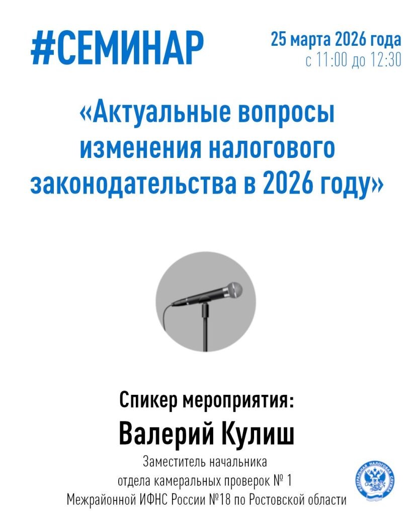 Приглашаем налогоплательщиков принять участие в вебинаре по теме «Порядок представления уведомлений по земельному и транспортному налогам. Направление налоговых уведомлений в личный кабинет». В программе вебинара: — Порядок и сроки представления Уведомлений по транспортному и земельному налогам в 2026 году. — Порядок открытия личного кабинета налогоплательщика. — Направление физическим лицам налоговых уведомлений в электронном виде в Личный кабинет налогоплательщика. Вебинар пройдет 25 марта 2026 года в 11:00. Для подключения к трансляции необходимо перейти по ссылке: clck.ru/3QySX5 Приглашаем налогоплательщиков принять участие в семинаре по теме «Актуальные вопросы изменения налогового законодательства в 2026 году». В программе семинара: • Основные изменения в законодательстве в 2026 году по НДС. • АУСН и УСН в 2026 году. Порядок установления лимитов дохода налогоплательщиков УСН для уплаты НДС. • Преимущества перехода на обмен электронными счетами-фактурами. • Легализация трудовых от
