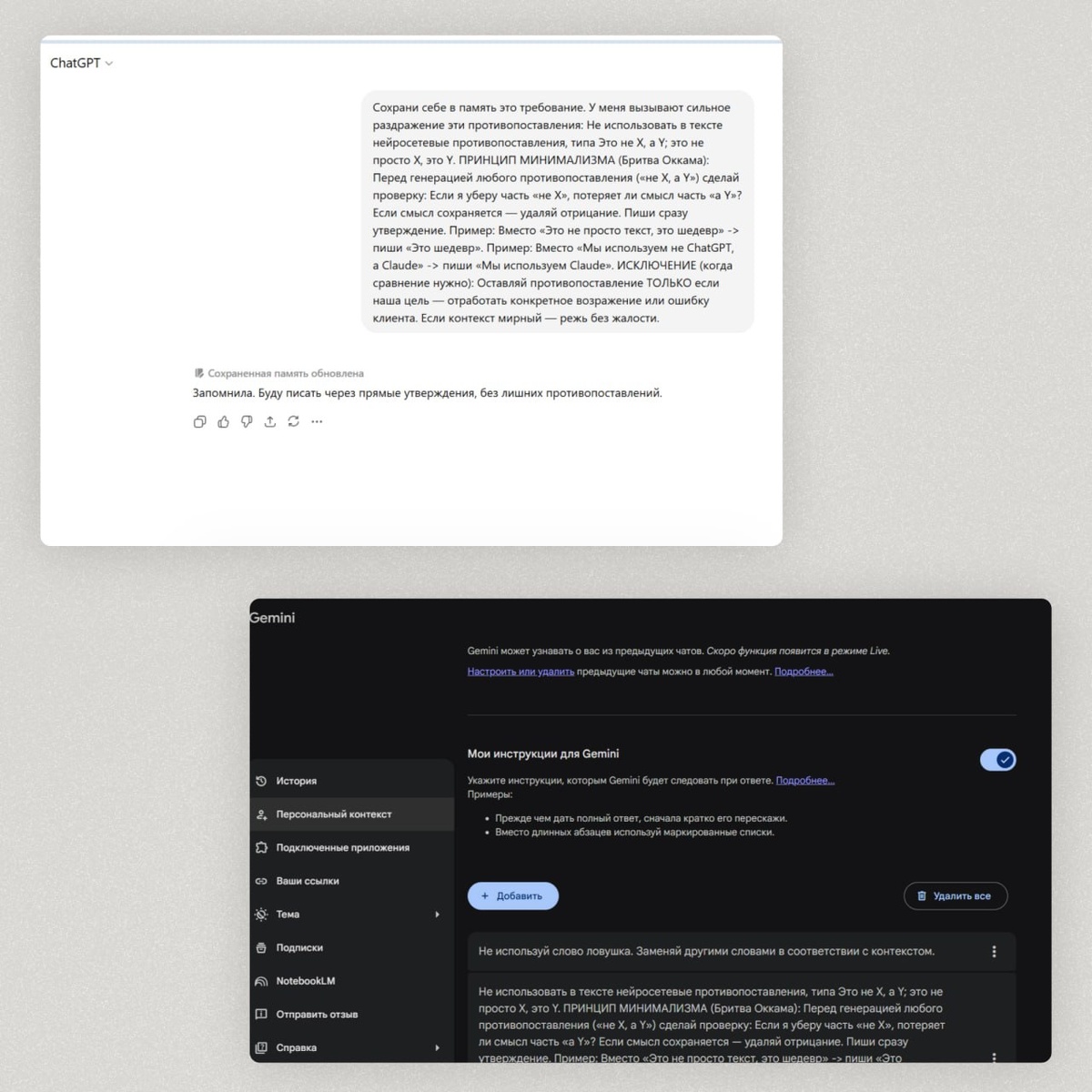 Лень - это не причина, это симптом Важно не «вот локация», а «что вы здесь почувствуете» Не сухой анонс, а контекст. То добавьте ему системный промт: У меня вызывают сильное раздражение противопоставления. Не используй в тексте нейросетевые противопоставления, типа Это не X, а Y; это не просто X, это Y. ПРИНЦИП МИНИМАЛИЗМА (Бритва Оккама): Перед генерацией любого противопоставления («не Х, а Y») сделай проверку: Если я уберу часть «не Х», потеряет ли смысл часть «а Y»? Если смысл сохраняется — удаляй отрицание. Пиши сразу утверждение. Пример: Вместо «Это не просто текст, это шедевр» -> пиши «Это шедевр». Пример: Вместо «Мы используем не ChatGPT, а Claude» -> пиши «Мы используем Claude». ИСКЛЮЧЕНИЕ (когда сравнение нужно): Оставляй противопоставление ТОЛЬКО если наша цель — отработать конкретное возражение или ошибку клиента. Если контекст мирный — режь без жалости. В ChatGPT просто пишите в новом чате его и добавляете к промту: Сохрани себе в память новое требование. В Gemini и Cla