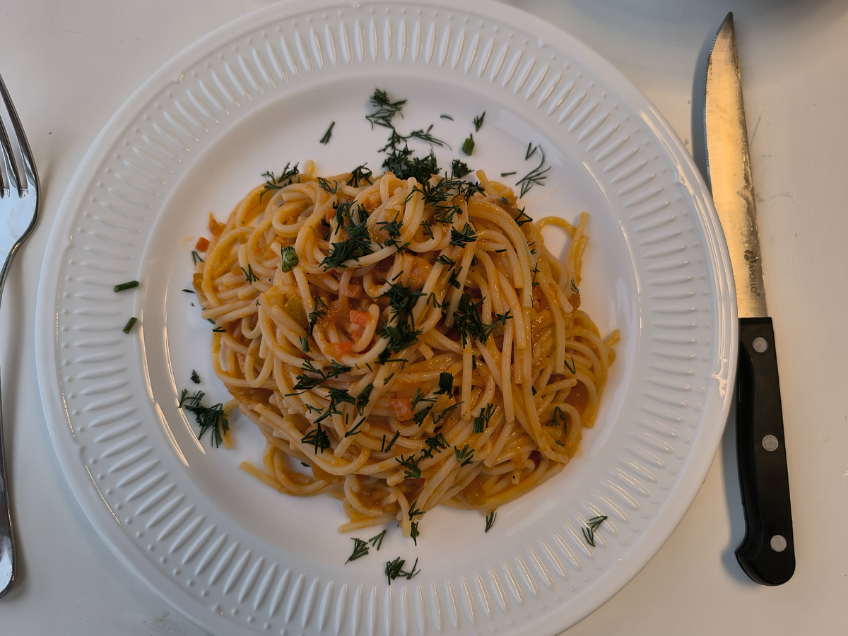 Утро в Анапе выдалось туманное. С Лысой горы на город сполз туман и поглотил окрестности. Я проснулась в 6.30 по будильнику и всё равно ничего не успела. Встреча со знакомой была назначена на 8.00. Пришлось вместо меня супругу бежать на встречу. Чем же занималась с утра, что утро пошло не по плану? Сначала своими рутинами конечно же. Чай не пила, в окно не смотрела. Сразу занялась завтраком: спагетти с кабачками.