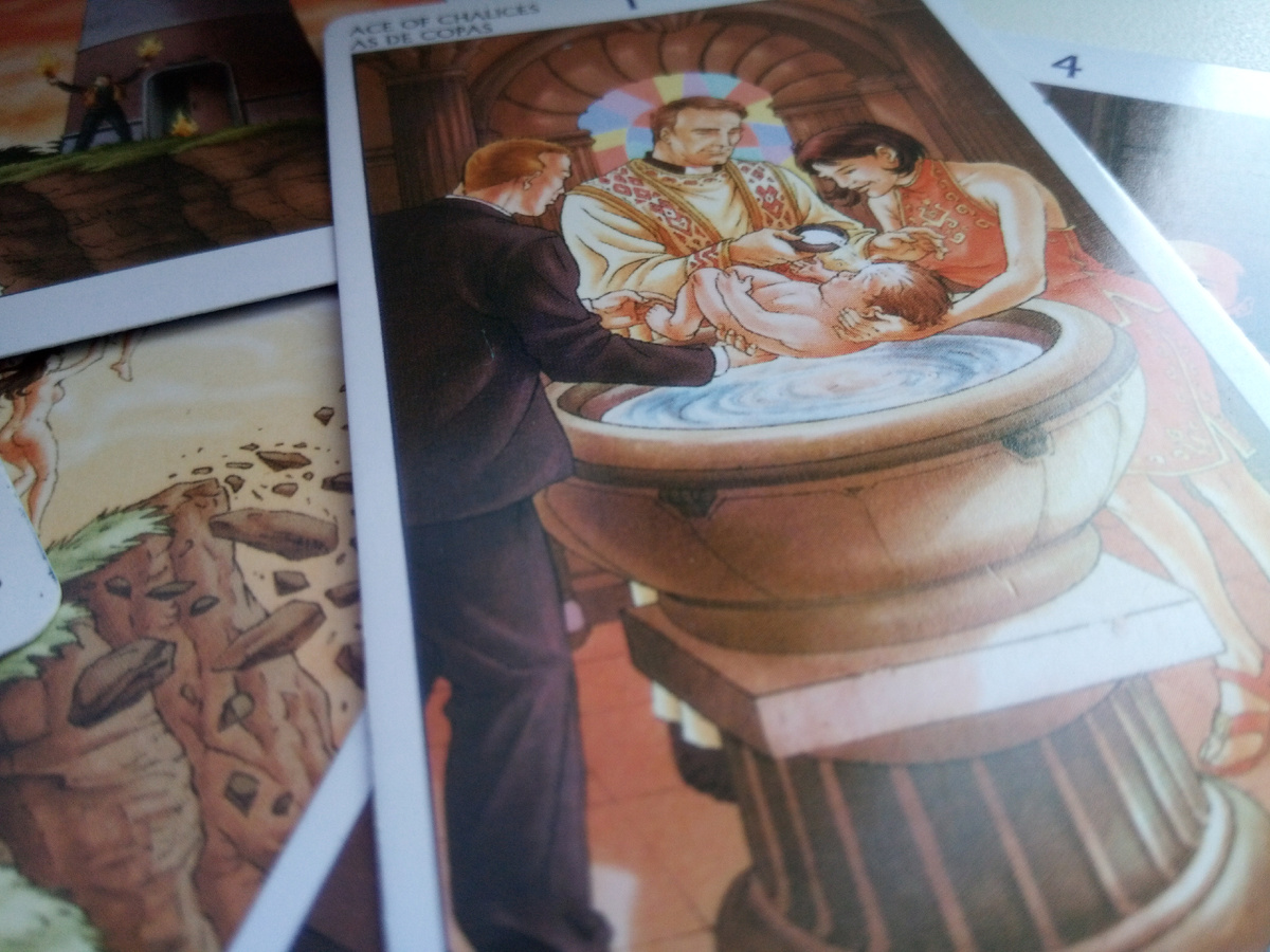 Карта "Туз Кубков" в этой колоде очень интересная... Здесь видим купель со святой водой, куда помещают младенца с целью совершения обряда Крещения. Что значит Креститься, принять Крещение? Это значит - взять на себя обязательства по борьбе с нечистью и всякой несправедливостью в этом грешном мире людей. Т.е., это значит стать посвящённым в таинства церкви, либо какого-то иного сообщества, живущего, существующего по своим законам. Эта карта символизирует крупное событие или какое-то стечение обстоятельств, которое скоро подведет некую черту под всем тем, чем вы жили ранее. Тот горький опыт, а он, действительно, был горький в чем-то...Опять же, "Туз Кубков" - испить Чашу Горечи до дна, гласит нам карта... Так вот, тот опыт совсем скоро трансформируется в абсолютно новое для вас восприятие окружающей действительности.
