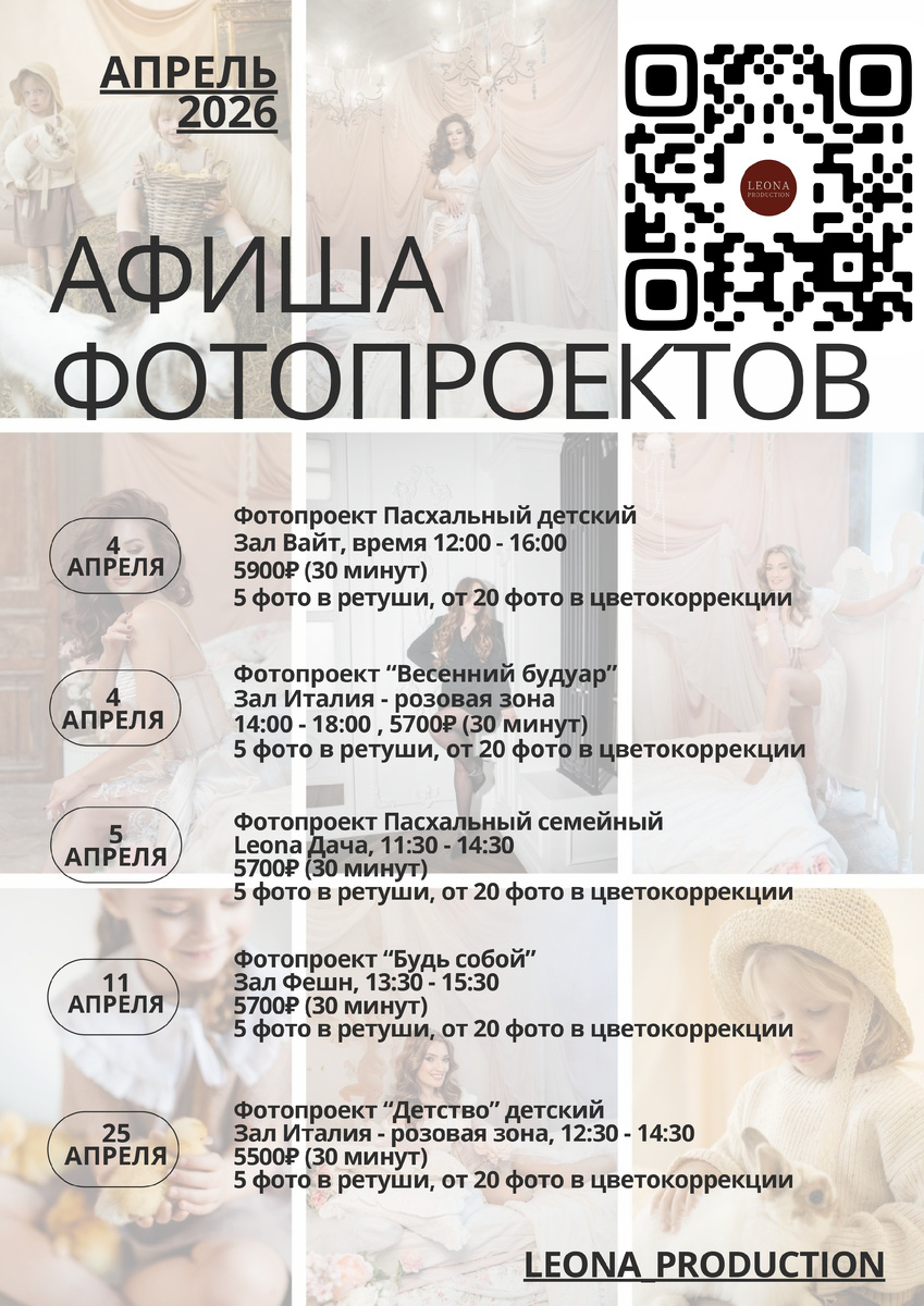 Мы подготовили расписание фотопроектов, которые будут проходить в апреле. Сохраняйте себе и записывайтесь! Узнать больше информации или забронировать можно, написав нам в личные сообщения @leonastage_photostudio или по телефону +7 812 64-64-764