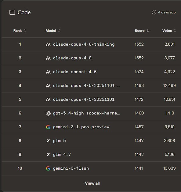 Я пользуюсь Gemini 3.1 Pro в быту, но программисты голосуют пальчиками за другие модели. И разрыв ведь очень большой с лидерами... @clickfraud.ru