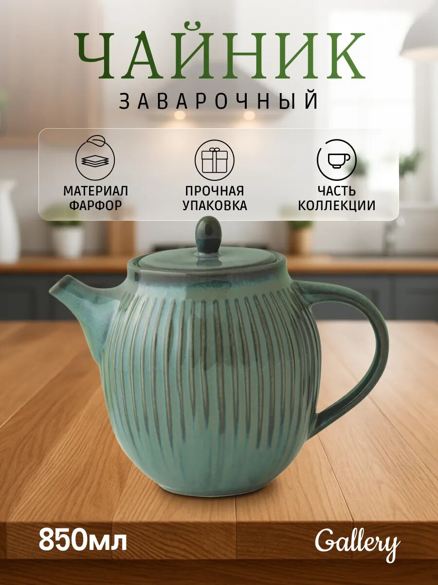 Керамический заварочный чайник объёмом 850 мл в нежном бирюзовом цвете с вертикальным рифлением. Классическая форма с удобной ручкой и крышкой.