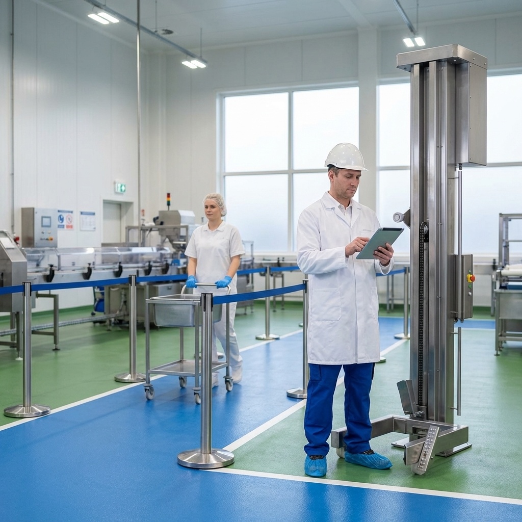Гидравлические подъёмники создают естественную границу между санитарными зонами. Вертикальное перемещение автоматически переводит продукт из «грязной» зоны в «чистую», исключая обратную контаминацию.