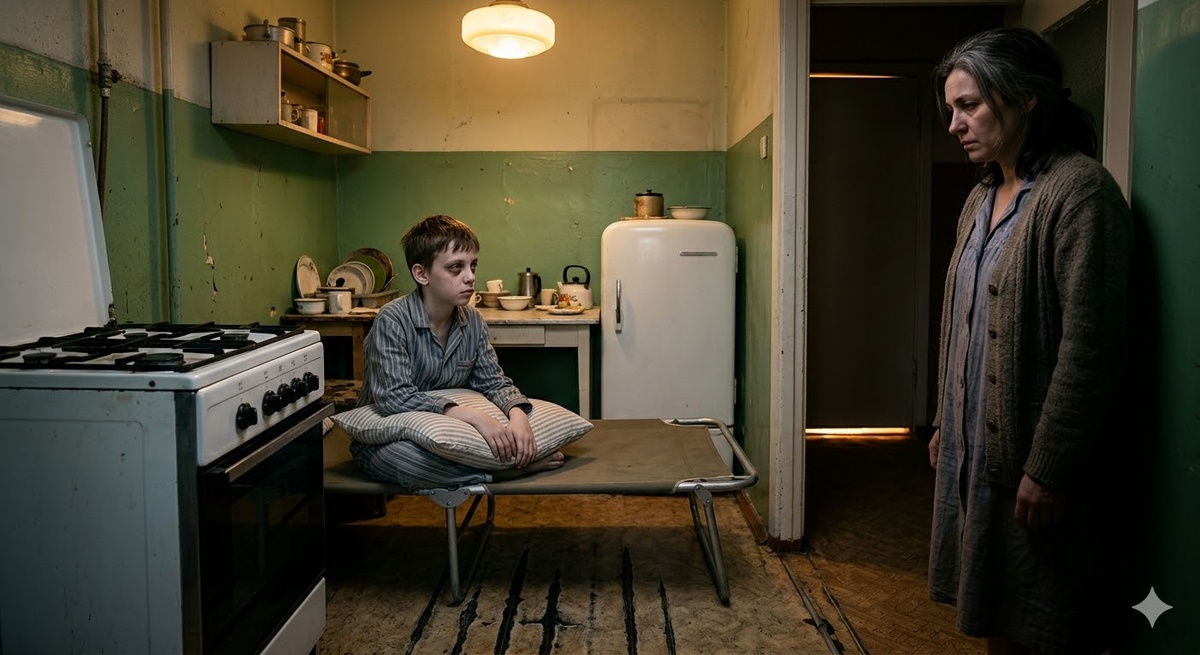 Константин стоял у холодильника. Дверца была открыта, и холодный воздух тянул по ногам. Рядом, на полу, — борозды от раскладушки. Три месяца. Девяносто ночей, когда его десятилетний сын засыпал между плитой и холодильником.