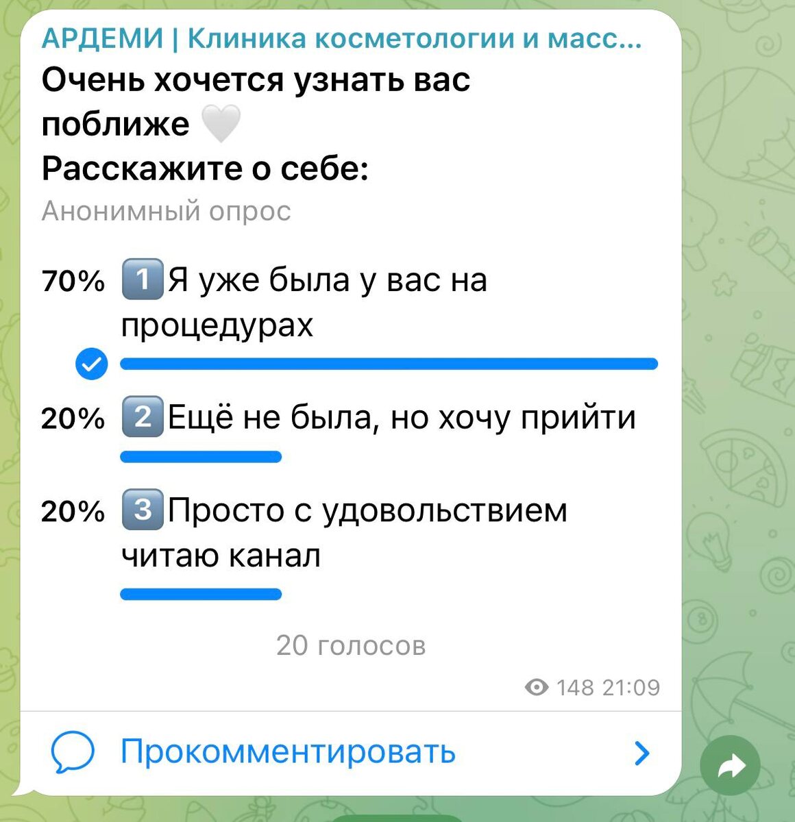 … Мы провели опрос, чтобы узнать вас поближе — и так хотелось услышать больше ваших голосов. Но даже по этим ответам мы сделали важные выводы 👇 ✨ 70% — уже с нами и доверяют нам свою красоту ✨ 20% — только планируют прийти ✨ 20% — пока просто наблюдают И знаете что? Мы хотим стать ближе к каждому 🤍 Поэтому дарим подарки всем: 💎 Если вы ещё не были у нас или только присматриваетесь (2 и 3 вариант): — скидка 20% на любую процедуру Идеальный повод познакомиться с АРДЕМИ ✨ 💎 Если вы уже наш пациент(1 вариант): — скидка 20% на любую новую для вас процедуру Попробуйте то, что давно откладывали 😉 Это наш способ сказать: мы вас ценим, даже если вы пока только наблюдаете 🤍 Напишите нам в личные сообщения слово «ОПРОС», и мы подберём процедуру именно для вас ✨ 🤞Воспользоваться предложением можно до конца марта! 📱Пишите в комментарии и лс 📱Запись по телефону: +79256535001 👉 Перейти в чат-бот MAX https://max.ru/id7701907209_bot
