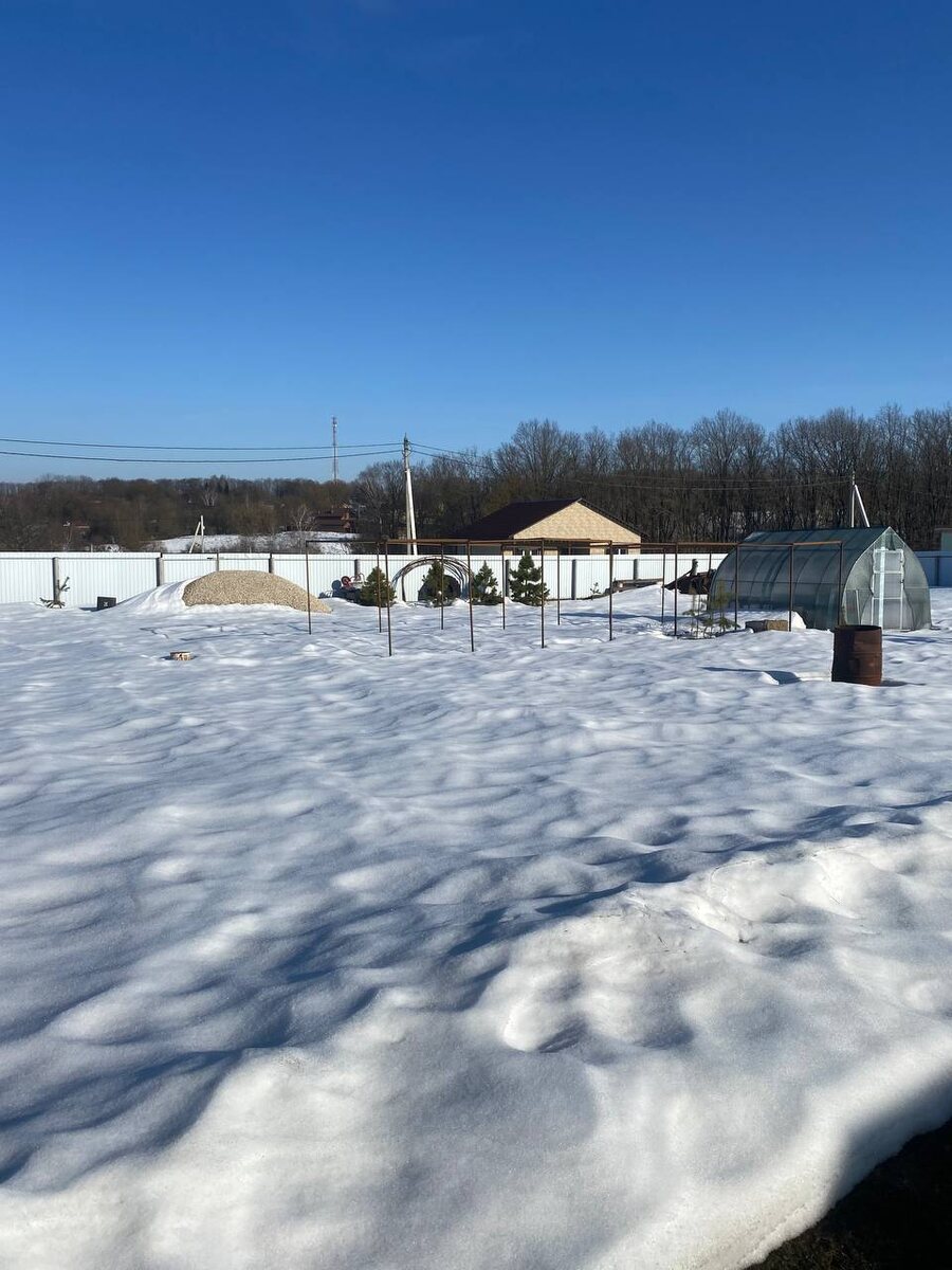 Снег сходит, но не так быстро, как хотелось бы… В некоторых местах проваливаюсь по колено и выше🫣 Весь участок нам пока не нужен, пусть тает с природной скоростью, а вот горшочкам немножко поможем… Рассыпали над всей зимовкой обыкновенную золу, «зачернили» снег😎 Никакой химии, сплошная польза растюшкам)) В череночнике оттаяла бочка с водой🥳Бочка цела, опыт с бутылями был удачным, берём на вооружение